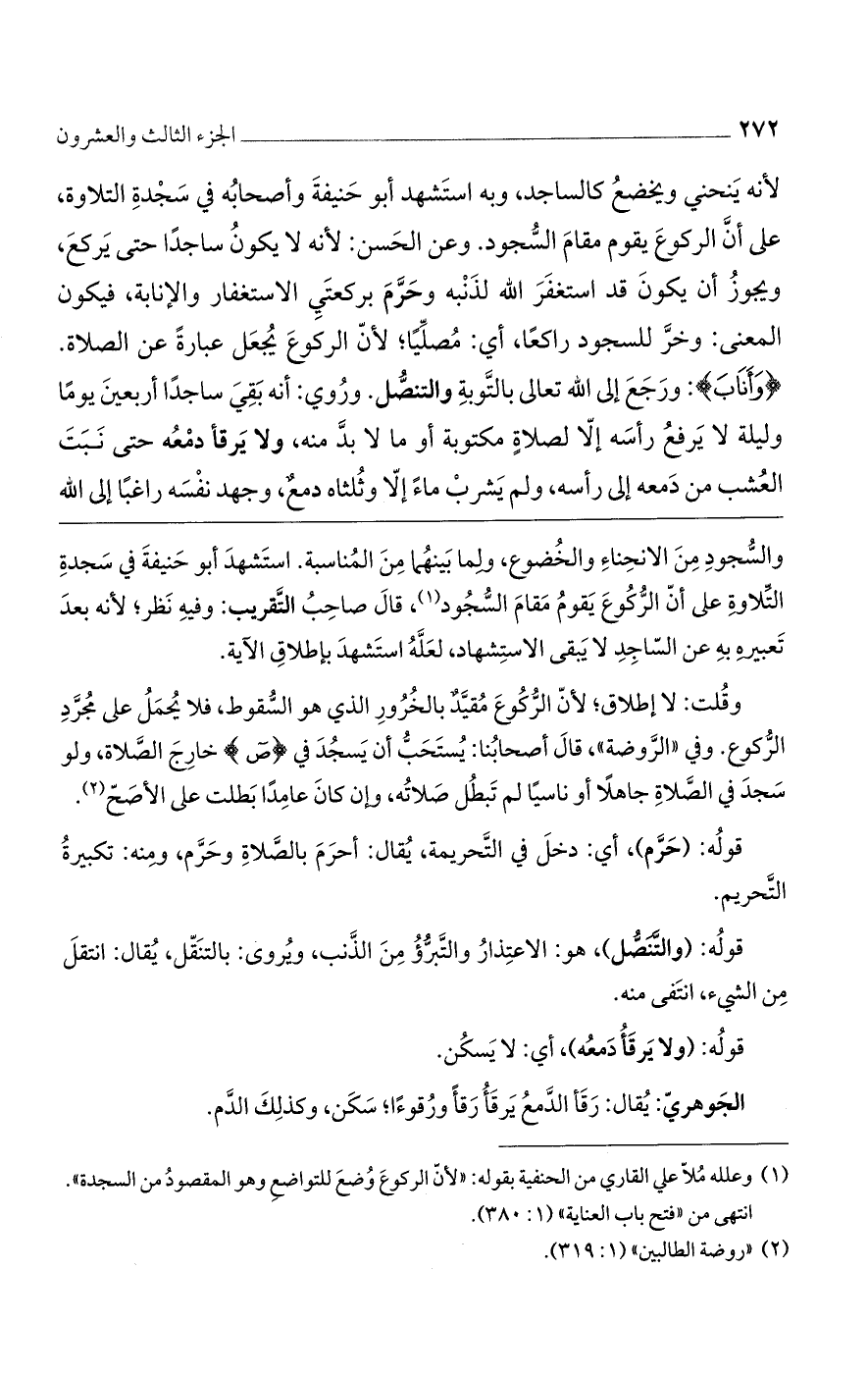 والسجود من الانحناء والخضوع، ولما بينهما من المناسبة. استشهد أبو حنيفة في سجدة التلاوة على أن الركوع يقوم مقام السجود، قال صاحب التقريب: وفيه نظر؛ لأنه بعد تعبيره به عن الساجد لا يبقى الاستشهاد، لعله استشهد بإطلاق الآية.