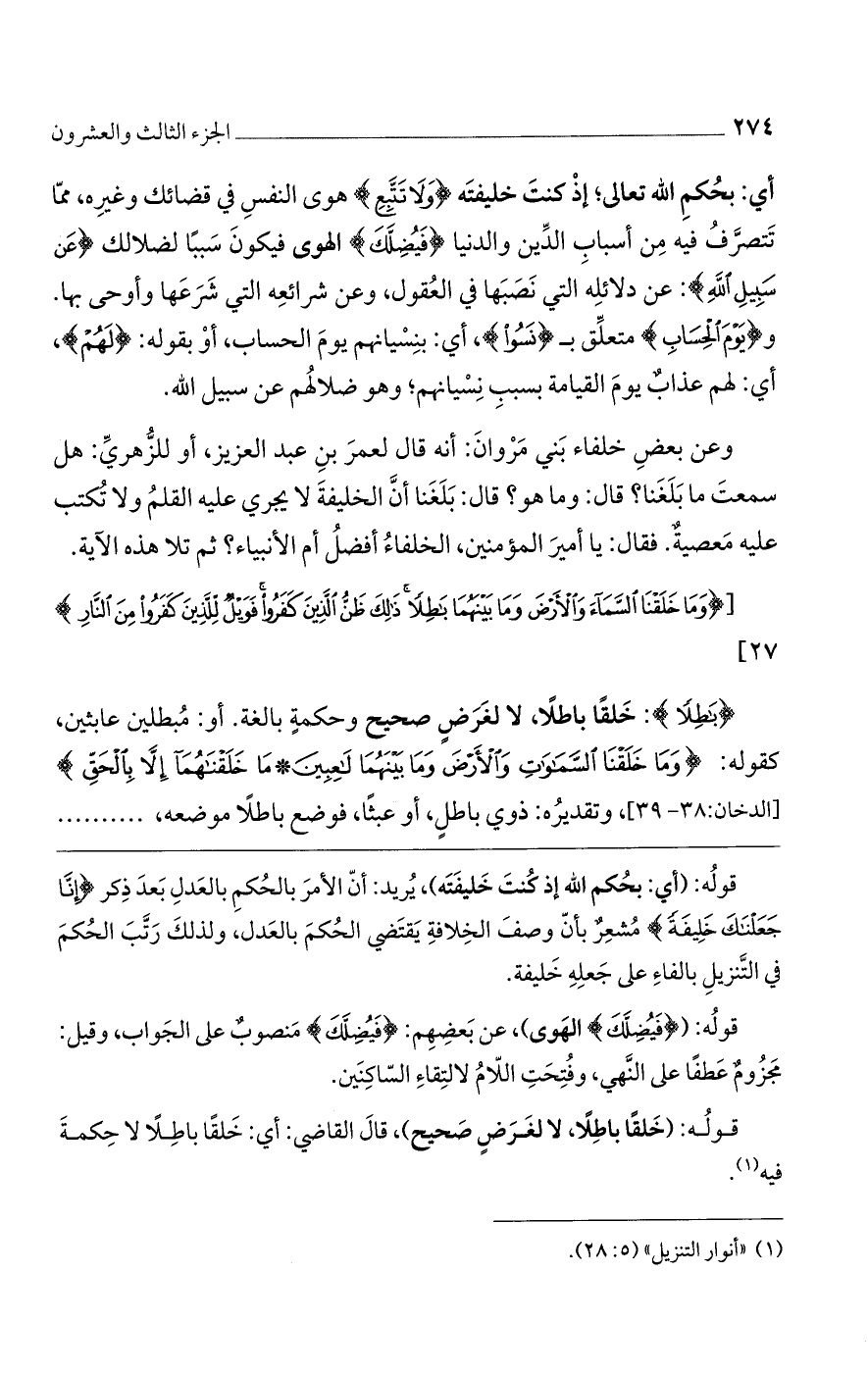 أي: بحكم الله تعالى؛ إذا كنت خليفته {وَلَا تَتَّبِعِ} هوى النفس في قضائك وغيره، مما تتصرف فيه من أسباب الدين والدنيا {فَيُضِلَّكَ} الهوى فيكون سببًا لضلالك {عَن سَبِيلِ اللهِ}: عن دلائله التي نصبها في العقول، وعن شرائعه التي شرعها وأوحى بها. و {يَوْمَ الْحِسَابِ} متعلق بـ {نَسُوا}، أي: بنسيانهم يوم الحساب، أو بقوله: {لَهُمْ}، أي: لهم عذاب يوم القيامة بسبب نسيانهم؛ وهو ضلالهم عن سبيل الله.