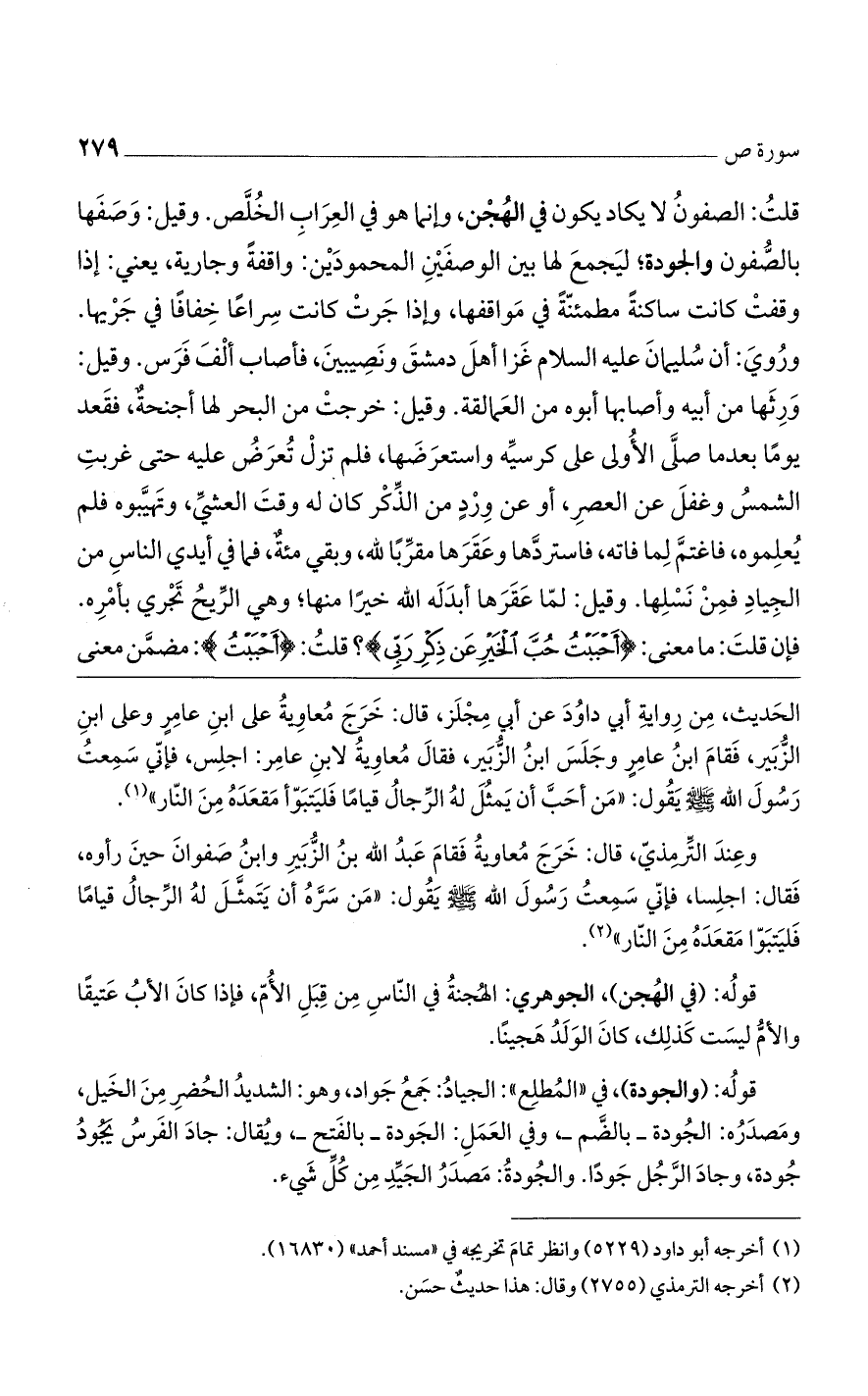 قلت: الصفون لا يكاد يكون في الهجن، وإنما هو في العراب الخلص. وقيل: وصفها بالصفون والجودة؛ ليجمع لها بين الوصفين المحمودين: واقفة وجارية، يعني: إذا وقفت كانت ساكنة مطمئنةً في مواقفها، وإذا جرت كانت سراعًا خفافًا في جريها. وروي: أن سليمان عليه السلام غزا أهل دمشق ونصيبين، فأصاب ألف فرس. وقيل: ورثها من أبيه وأصابها أبوه من العمالقة. وقيل: خرجت من البحر لها أجنحة، فقعد يومًا بعدما صلى الأولى على كرسيه واستعرضها، فلم تزل تعرض عليه حتى غربت الشمس وغفل عن العصر، أو عن ورد من الذكر كان له وقت العشي، وتهيبوه فلم يعلموه، فاغتم لما فاته، فاستردها وعقرها مقر بالله، وبقي مئة، فما في أيدي الناس من الجياد فمن نسلها. وقيل: لما عقرها أبدله الله خيرًا منها؛ وهي الريح تجري بأمره.