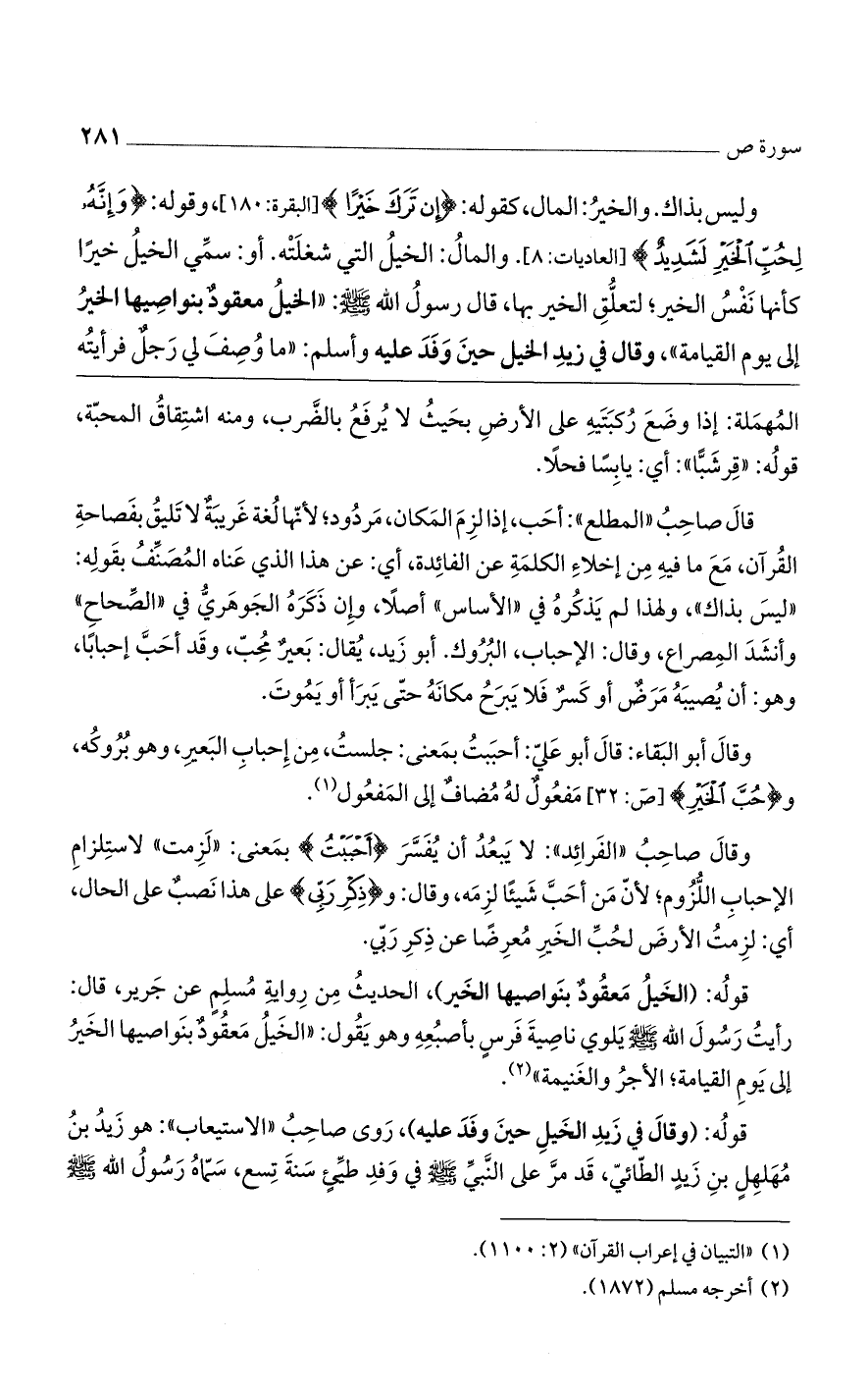 وليس بذاك. والخير: المال، كقوله: {إِنْ تَرَكَ خَيْرًا} [البقرة: 180]، وقوله {وَإِنَّهُ لِحُبِّ الْخَيْرِ لَشَدِيدٌ} [العاديات: 8]. والمال: الخيل التي شغلته. أو: سمي الخيل خيرًا كأنها نفس الخير؛ لتعلق الخير بها، قال رسول الله صلى الله عليه وسلم: "الخيل معقود بنواصيها الخير إلى يوم القيامة"، وقال في زيد الخيل حين وفد عليه وأسلم: "ما وصف لي رجل فرأيته