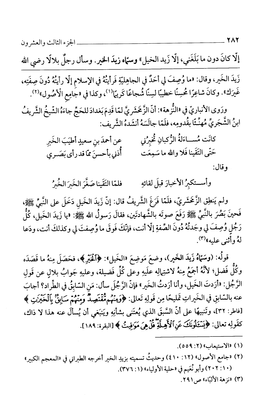 ولم ينطق الزمخشري، فلما فرغ الشريف قال: إن زيد الخيل دخل على النبي صلى الله عليه وسلم، فحين بصر بالنبي صلى الله عليه وسلم رفع صوته بالشهادتين، فقال رسول الله صلى الله عليه وسلم: "يا زيد الخيل، كل رجل وصف لي وجدته دون الصفة إلا أنت، فإنك فوق ما وصفت لي وكذلك أنت، ودعا له وأثنى عليه".