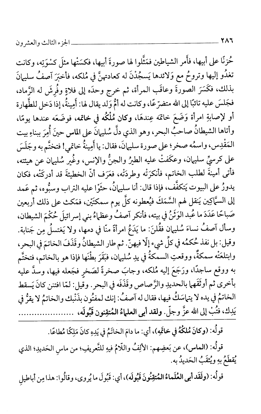 حزنًا على أبيها، فأمر الشياطين فمثلوا لها صورة أبيها، فكستها مثل كسوته، كانت تغدو إليها وتروح مع ولائدها يسجدن له كعادتهن في ملكه، فأخبر آصف سليمان بذلك، فكسر الصورة وعاقب المرأة، ثم خرج وحده إلى فلاة وفرش له الرماد، فجلس عليه تائبًا إلى الله متضرعًا، وكانت له أم ولد يقال لها: أمينة، إذا دخل للطهارة أو لإصابة امرأة وضع خاتمه عندها، وكان ملكه في خاتمه، فوضعه عندها يومًا، وأتاها الشيطان صاحب البحر، وهو الذي دل سليمان على الماس حين أمر ببناء بيت المقدس، واسمه صخر؛ على صورة سليمان، فقال: يا أمينة خاتمي! فتختم به وجلس على كرسي سليمان، وعكفت عليه الطير والجن والإنس، وغير سليمان عن هيئته، فأتى أمينة لطلب الخاتم، فأنكرته وطردته، فعرف أن الخطيئة قد أدركته، فكان يدور على البيوت يتكفف، فإذا قال: أنا سليمان، حثوا عليه التراب وسبوه، ثم عمد إلى السماكين ينقل لهم السمك فيعطونه كل يوم سمكتين، فمكث على ذلك أربعين صباحًا عدد ما عبد الوثن في بيته، فأنكر آصف وعظماء بني إسرائيل حكم الشيطان، وسأل آصف نساء سليمان فقلن: ما يدع امرأة منا في دمها، ولا يغتسل من جنابة. وقيل: بل نفذ حكمه في كل شيء إلا فيهن. ثم طار الشيطان وقذف الخاتم في البحر، وابتلعته سمكة، ووقعت السمكة في يد سليمان، فبقر بطنها فإذا هو الخاتم، فتختم به ووقع ساجدًا، ورجع إليه ملكه، وجاب صخرةً لصخر فجعله فيها، وسد عليه بأخرى ثم أوثقهما بالحديد والرصاص وقذفه في البحر. وقيل: لما افتنن كان يسقط الخاتم في يده لا يتماسك فيها، فقال له آصف: إنك لمفتون بذنبك والخاتم لا يقر في يدك، فتب إلى الله عز وجل. ولقد أبى العلماء المتقنون قبوله،