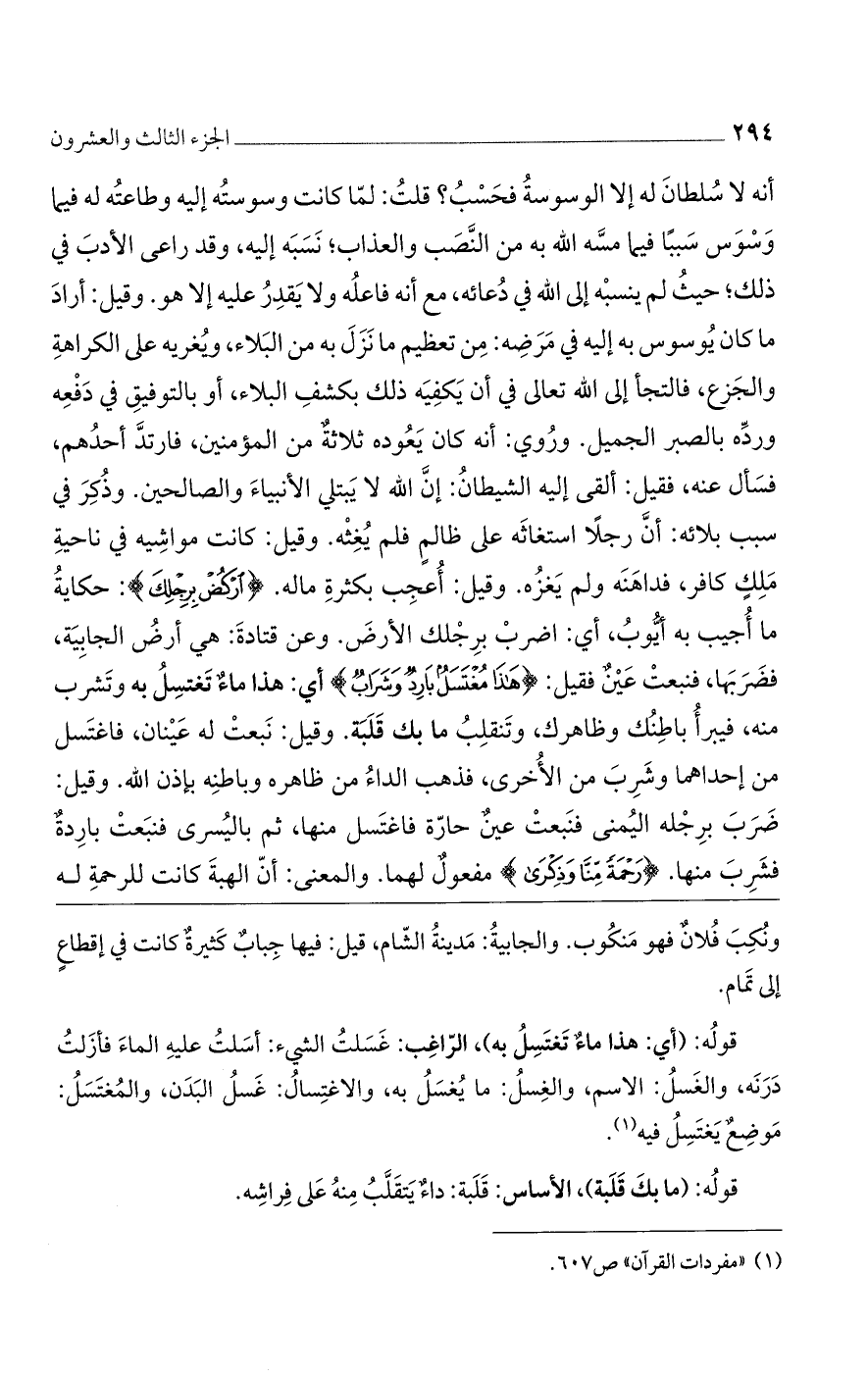 أنه لا سلطان له إلا الوسوسة فحسب؟ قلت: لما كانت وسوسته إليه وطاعته له فيما وسوس سببًا فيما مسه الله به من النصب والعذاب؛ نسبه إليه، وقد راعى الأدب في ذلك؛ حيث لم ينسبه إلى الله في دعائه، مع أنه فاعله ولا يقدر عليه إلا هو. وقيل: أراد ما كان يوسوس به إليه في مرضه: من تعظيم ما نزل به من البلاء، ويغريه على الكراهة والجزع، فالتجأ إلى الله تعالى في أن يكفيه ذلك بكشف البلاء، أو بالتوفيق في دفعه ورده بالصبر الجميل. وروي: أنه كان يعوده ثلاثة من المؤمنين، فارتد أحدهم، فسأل عنه، فقيل: ألقى إليه الشيطان: إن الله لا يبتلي الأنبياء والصالحين. وذكر في سبب بلائه: أن رجلًا استغاثه على ظالم فلم يغثه. وقيل: كانت مواشيه في ناحية ملك كافر، فداهنه ولم يعزه. وقيل: أعجب بكثرة ماله. {ارْكُضْ بِرِجْلِكَ}: حكاية ما أجيب به أيوب، أي: اضرب برجلك الأرض. وعن قتادة: هي أرض الجابية، فضربها، فنبعت عين فقيل: {هَذَا مُغْتَسَلٌ بَارِدٌ وشَرَابٌ} أي: هذا ماء تغتسل به وتشرب منه، فيبرأ باطنك وظاهرك، وتنقلب ما بك قلبة. وقيل: نبعت له عينان، فاغتسل من إحداهما وشرب من الأخرى، فذهب الداء من ظاهره وباطنه بإذن الله. وقيل: ضرب برجله اليمنى فنبعت عين حارة فاغتسل منها، ثم باليسرى فنبعت باردة فشرب منها. {رَحْمَةً مِّنَّا وذِكْرَى} مفعول لهما. والمعنى: أن الهبة كانت للرحمة له