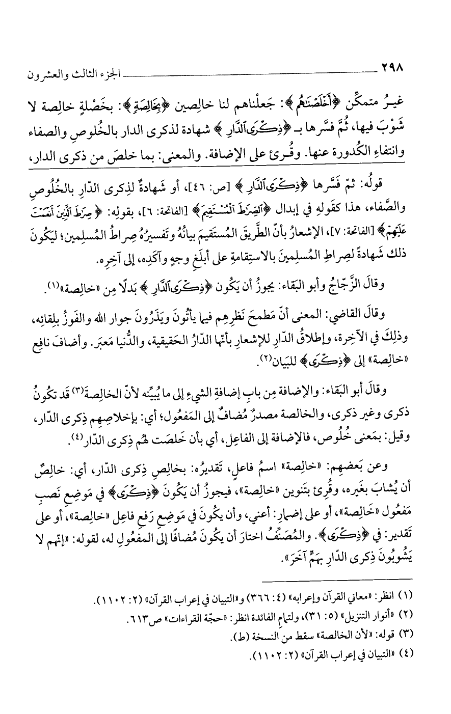 قوله: ثم فسرها {ذِكْرَى الدَّارِ} [ص: 46]، أو شهادة لذكرى الدار بالخلوص والصفاء، هذا كقوله في إبدال {الصِّرَاطَ الْمُسْتَقِيمَ} [الفاتحة: 6]، بقوله: {صِرَاطَ الَّذِينَ أَنْعَمْتَ عَلَيْهِمْ غَيْرِ} [الفاتحة: 7]، الإشعار بأن الطريق المستقيم بيانه وتفسيره صراط المسلمين؛ ليكون ذلك شهادة لصراط المسلمين بالاستقامة على أبلغ وجه وآكده، إلى آخره.