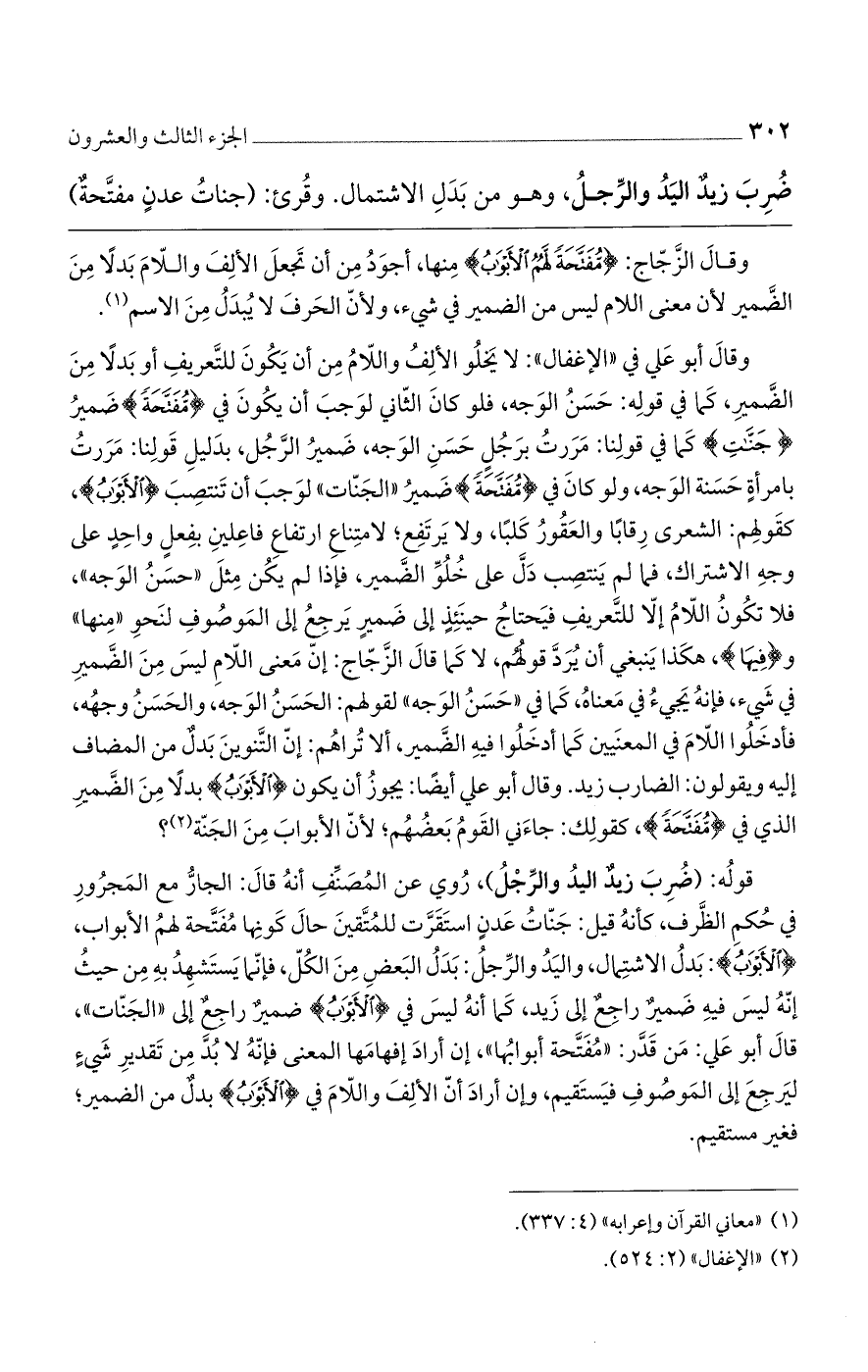 وقال أبو علي في "الإغفال": لا يخلو الألف واللام من أن يكون للتعريف أو بدلًا من الضمير، كما في قوله: حسن الوجه، فلو كان الثاني لوجب أن يكون في {مُّفَتَّحَةً} ضمير {جَنَّاتٍ} كما في قولنا: مررت برجل حسن الوجه، ضمير الرجل، بدليل قولنا: مررت بامرأة حسنة الوجه، ولو كان في {مُّفَتَّحَةً} ضمير " الجنات" لوجب أن تنتصب {الأَبْوَابُ}، كقوله: الشعرى رقابًا والعقور كلبًا، ولا يرتفع؛ لا متناع ارتفاع فاعلين بفعل واحد على وجه الاشتراك، فما لم ينتصب دل على خلو الضمير، فإذا لم يكن مثل "حسن الوجه"، فلا تكون اللام إلا للتعريف فيحتاج حينئذ ألى ضمير يرجع إلى الموصوف لنحو "منها" و {فِيهَا}، هكذا ينبغي أن يرد قولهم، لا كما قال الزجاج: إن معنى اللام ليس من الضمير في شيء، فإنه يجبيء في معناه، كما في "حسن الوجه" لقولهم: الحسن الوجه، والحسن وجهه، فأدخلوا اللام في المعنيين كما أدخلوا فيه الضمير، ألا تراهم: إن التنوين بدل من المضاف إليه ويقولون: الضارب زيد. وقال أبو علي أيضًا: يجوز أن يكون {الأَبْوَابُ} بدلًا من الضمير الذي في {مُّفَتَّحَةً}، كقولك: جاءني القوم بعضهم؛ لأن الأبواب من الجنة؟