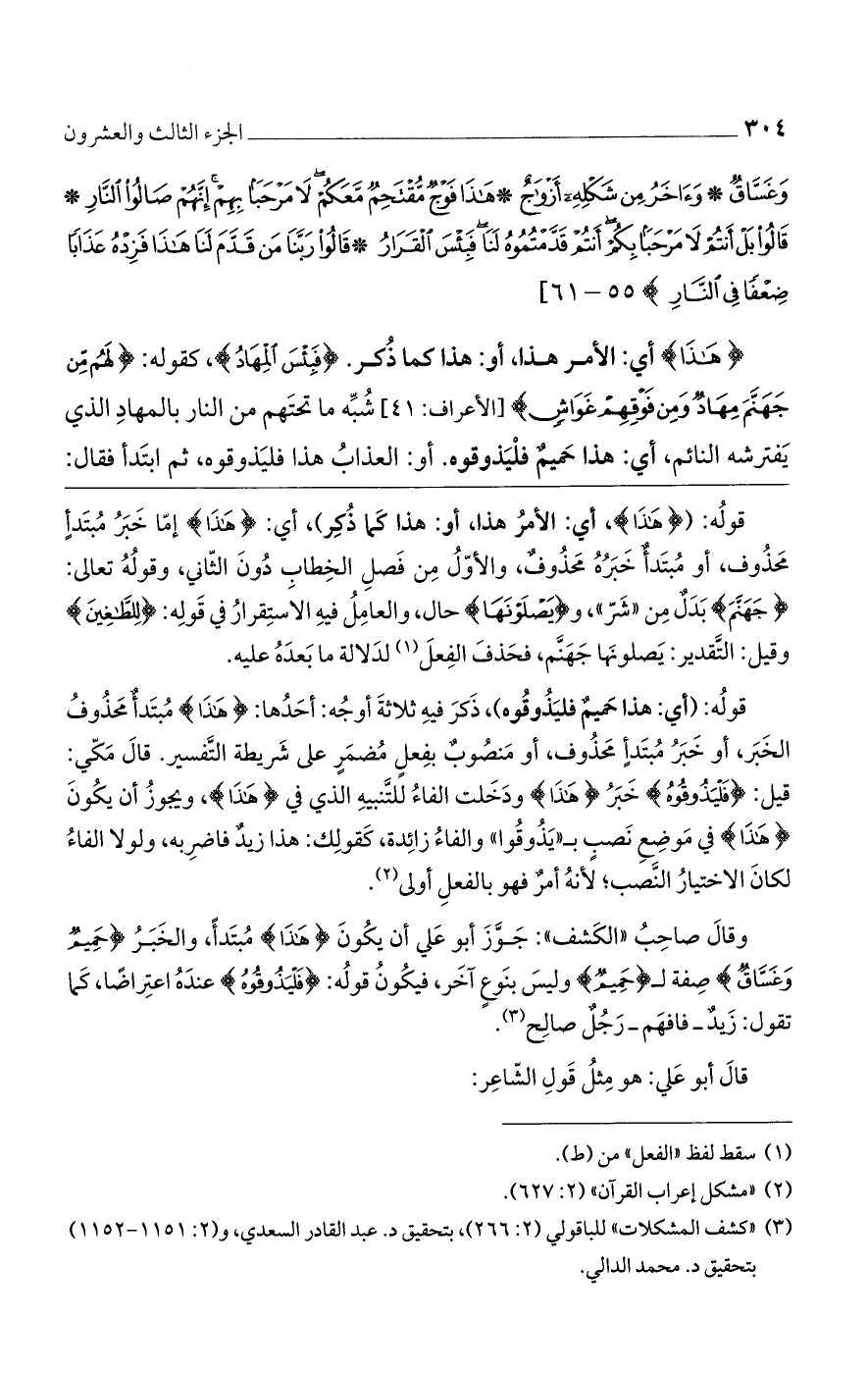 قوله: (أي: هذا حميم فليذوقوه)، ذكر فيه ثلاثة أوجه: أحدهما: {هَذَا} مبتدأ محذوف الخبر، أو خبر مبتدأ محذوف، أو منصوب بفعل مضمر على شريطة التفسير. قال مكي: قيل: {فَلْيَذُوقُوهُ} خبر {هَذَا} ودخلت الفاء للتنبيه الذي في {هَذَا}، ويجوز أن يكون {هَذَا} في موضع نصب بـ"يذوقوا" والفاء زائدة، كقولك: هذا زيد فاضربه، ولولا الفاء لكان الاختيار النصب؛ لأنه أمر فهو بالفعل أولى.