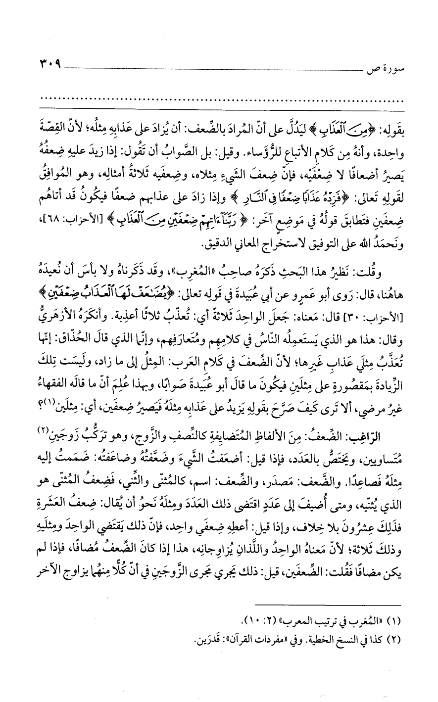 وقلت: نظير هذا البحث ذكره صاحب" المغرب"، وقد ذكرناه ولا باس أن نعيده ها هنا، قال: روى أبو عمرو عن أبي عبيدة في قوله تعالى: {يُضَاعَفْ لَهَا الْعَذَابُ ضِعْفَيْنِ} [الأحزاب: 30] قال: معناه: جعل الواحد ثلاثة أي: تعذب ثلاثًا أعذبة. وأنكره الأزهري وقال: هذا هو الذي يستعمله الناس في كلامهم ومتعارفهم، وإنما الذي قال الحذاق: إنما تعذب مثلي عذاب غيرها؛ لأن الضعف في كلام العرب: المثل إلى ما زاد، وليست تلك الزيادة بمقصورة على مثلين فيكون ما قال أبو عبيدة صوابًا، وبهذا علم أن ما قاله الفقهاء غير مرضي، ألا ترى كيف صرح بقوله يزيد على عذابه مثله فيصير ضعفين، أي: مثلين؟