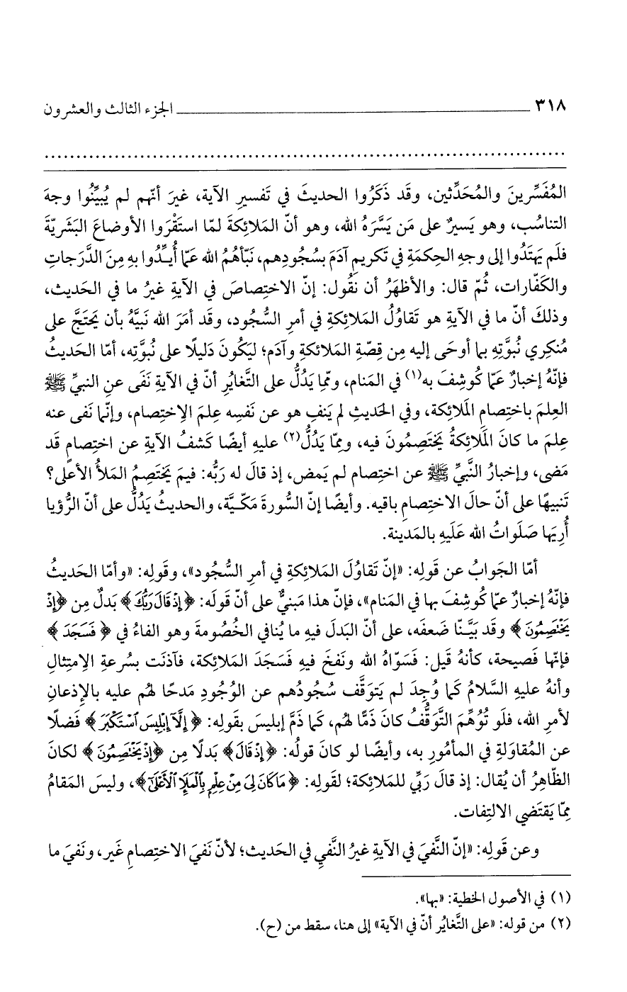 المفسرين والمحدثين، وقد ذكروا الحديث في تفسير الآية، غير أنهم لم يبينوا وجه التناسب، وهو يسير على من يسره الله، وهو أن الملائكة لما استقروا الأوضاع البشرية فلم يهتدوا إلى وجه الحكمة في تكريم آدم بسجودهم، نبأهم الله عما أيدوا به من الدرجات والكفارات، ثم قال: والأظهر أن نقول: الاختصاص في الآية غير ما في الحديث، وذلك أن ما في الآية هو تقاول الملائكة في أمر السجود، وقد أمر الله نبيه بأن يحتج على منكري نبوته بما أوحى إليه من قصة الملائكة وآدم؛ ليكون دليلًا على نبوته، أما الحديث فإنه إخبار عما كوشف به في المنام، ومما يدل على التغاير أن في الآية نفى عن النبي صلى الله عليه وسلم العلم باختصام الملائكة، وفي الحديث لم ينف هو عن نفسه علم الاختصام، وإنما نفى عنه علم ما كان الملائكة يختصمون فيه، مما يدل عليه أيضًا كشف الآية عن اختصام قد مضى، وإخبار النبي صلى الله عليه وسلم عن اختصام لم يمض، إذ قال له ربه: فيم يختصم الملأ الأعلى؟ تنبيها على أن حال الاختصام باقيه. وأيضًا إن السورة مكية، والحديث يدل على أن الرؤيا أريها صلوات الله عليه بالمدينة.