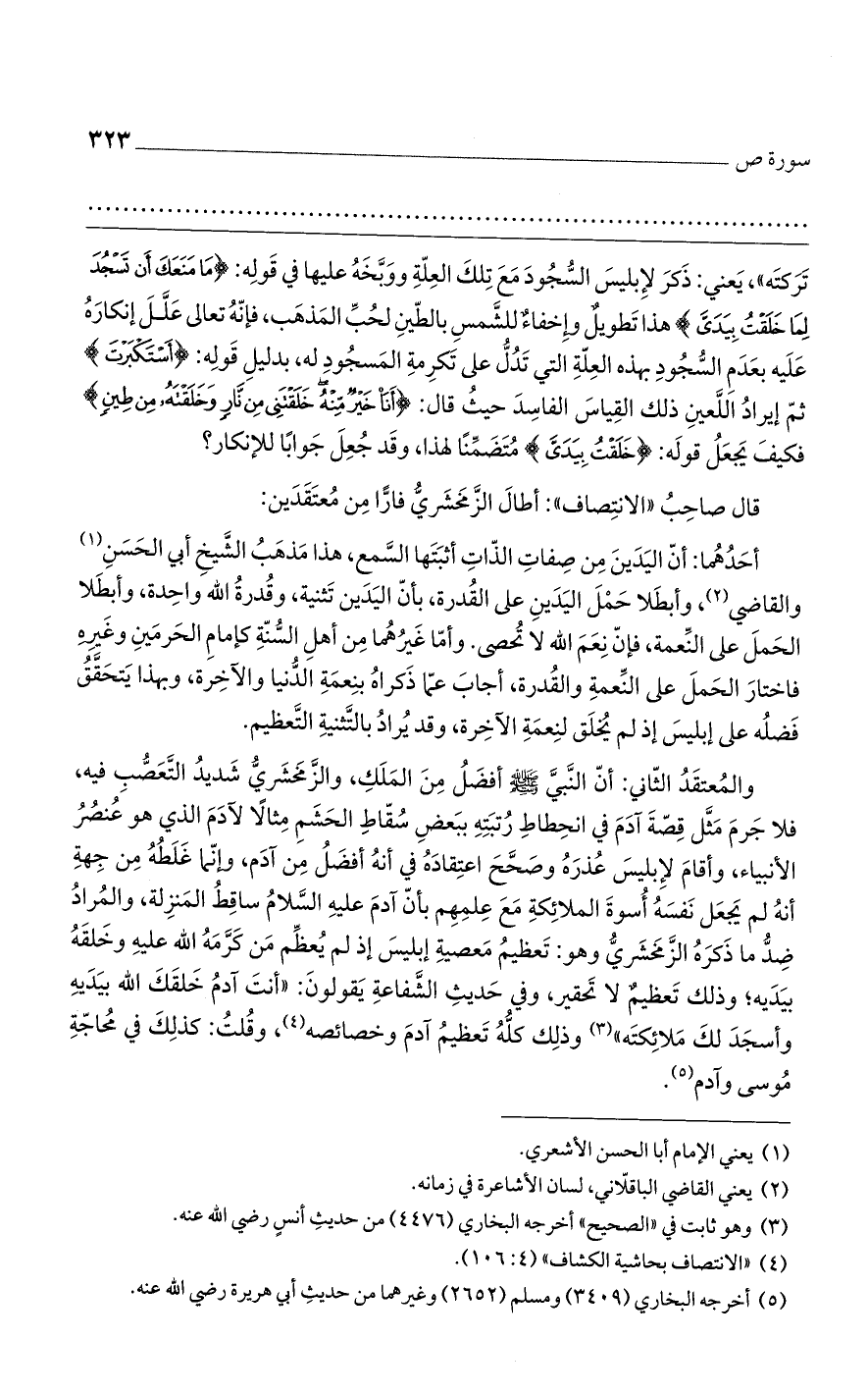 أحدهما: أن اليدين من صفات الذات أثبتها السمع، هذا مذهب الشيخ أبي الحسن والقاضي، وأبطلا حمل اليدين على القدرة، بأن اليدين تثنية، وقدرة الله واحدة، وأبطلا الحمل على النعمة، فإن نعم الله لا تحصى. وأما غيرهما من أهل السنة كإمام الحرمين وغيه فاختار الحمل على النعمة والقدرة، أجاب عما ذكراه بنعمة الدنيا والآخرة، وبهذا يتحقق فضله على إبليس إذ لم يخلق لنعمة الآخرة، وقد يراد بالتثنية التعظيم.