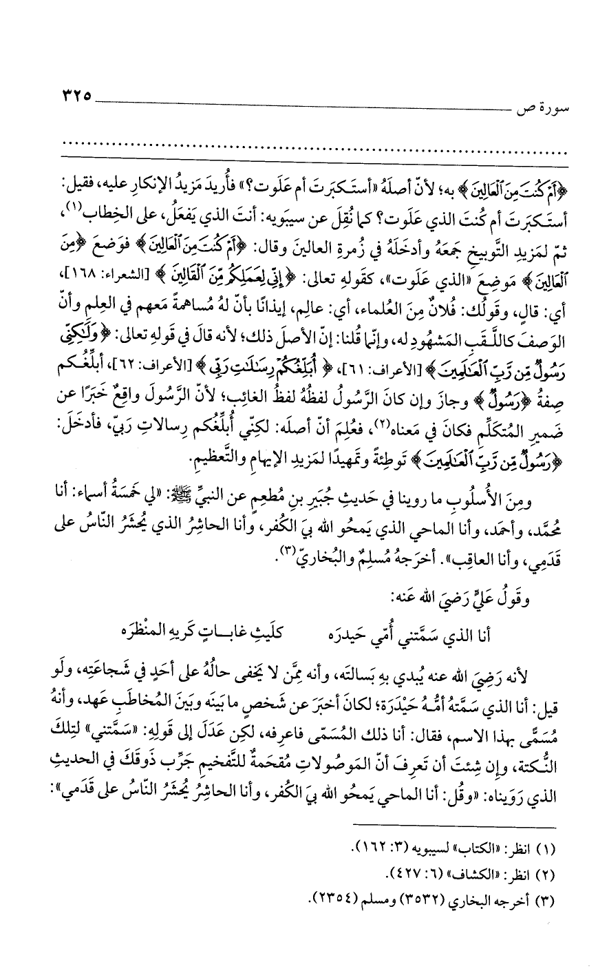 ومن الأسلوب ما روينا في حديث جبير بن مطعم عن النبي صلى الله عليه وسلم: "لي خمسة أسماء: أنا محمد، وأحمد، وأنا الماحي الذي يمحو الله بي الكفر، وأنا الحاشر الذي يحشر الناس على قدمي، وأنا العاقب". أخرجه مسلم والبخاري.