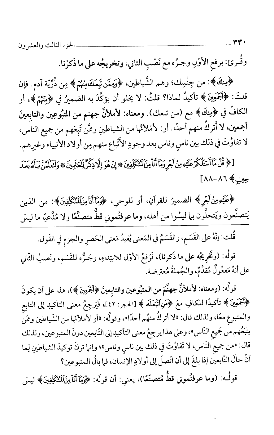 قوله: (ومعناه: لأملأن جهنم من المتبوعين والتابعين {أَجْمَعِينَ})، هذا على أن يكون {أَجْمَعِينَ} تأكيدًا للكاف مع {مَنِ اتَّبَعَكَ} [الحجر: 42]، فيرجع معنى التأكيد إلى التابع والمتبوع معًا، ولذلك قال: "لا أترك منهم أحدًا"، وقوله: "أو لأملأنها من الشياطين وممن يتبعهم من جميع الناس"، وعلى هذا يرجع معنى التأكيد إلى التابعين دون المتبوعين، ولذلك قال: "من جميع الناس، لا تفاوت في ذلك بين ناس وناس"؛ وإنما ترك توكيد الشياطين لما أن حال التابعين إذا بلغ إلى أن اتصل إلى أولاد الإنسان، فما بال المتبوعين؟