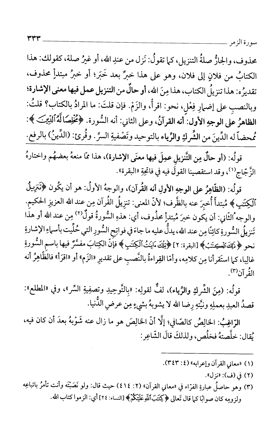 والوجه الثاني: أن يكون خبر مبتدأ محذوف، أي: هذه السورة قول من عند الله أو هذا تنزيل السورة كائنًا من عند الله، يدل عليه ما جاء في فواتح السور التي حليت بأسماء الإشارة نحو {ذَلِكَ الْكِتَابُ} [البقرة: 2] {تِلْكَ آيَاتُ الْكِتَابِ} فإن الكتاب مفسر فيها باسم السورة غالبا، كما استقرأنا من كلامه، وأما القراءة بالنصب على تقدير" الزم" أو اقرأ" فالظاهر أنه القرآن.