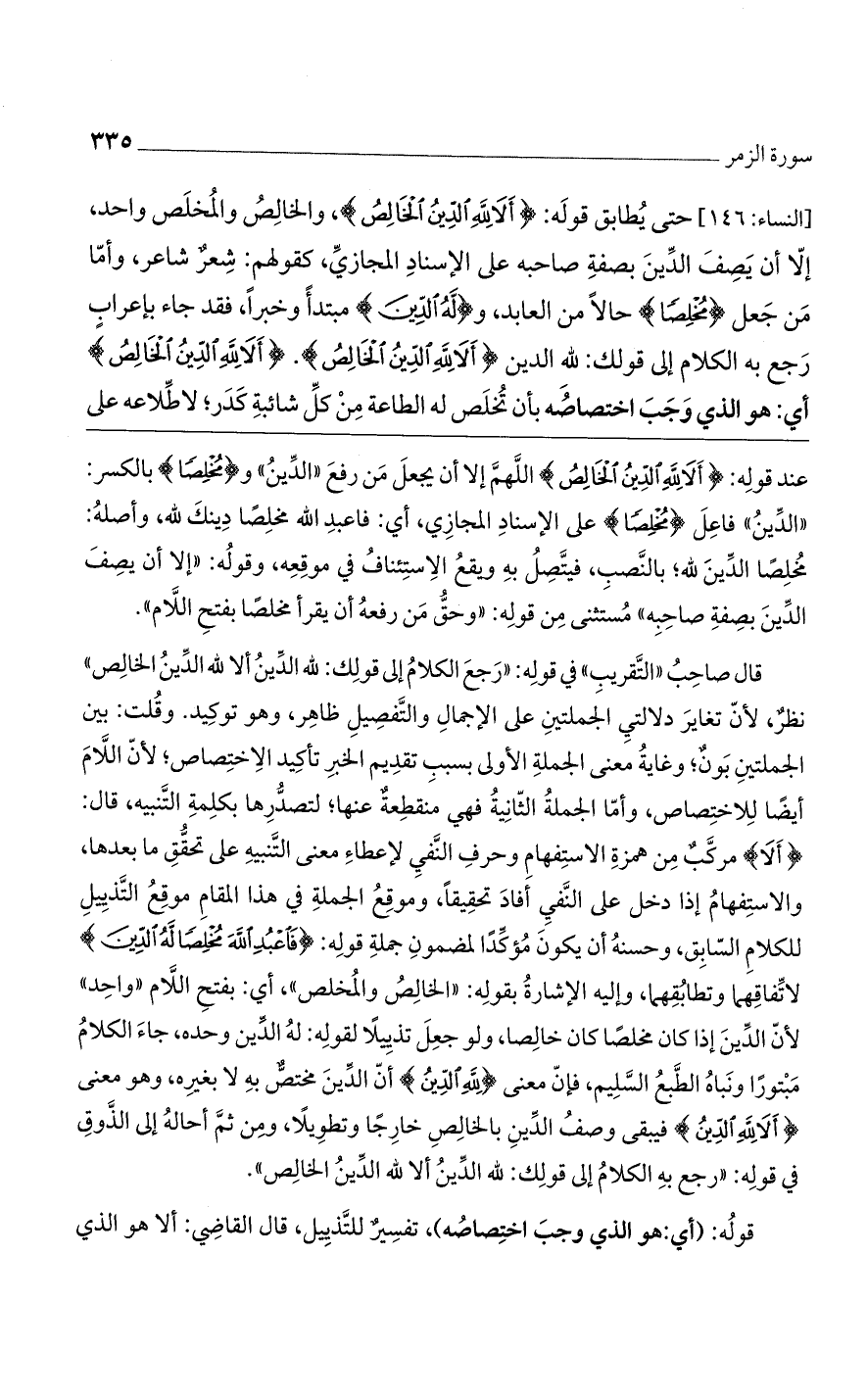 قال صاحب"التقريب" في قوله: "رجع الكلام إلى قولك: لله الدين ألا لله الدين الخالص" نظر، لأن تغاير دلالتي الجملتين على الإجمال والتفصيل ظاهر، وهو توكيد. وقلت: بين الجملتين بون؛ وغاية معنى الجملة الأولى بسبب تقديم الخبر تأكيد الاختصاص؛ لأن اللام أيضًا الاختصاص، وأما الجملة الثانية فهي منقطعة عنها؛ لتصدرها بكلمة التنبيه، قال: {ألَا} مركب من همزة الاستفهام وحرف النفي لإعطاء معنى التنبيه على تحقق ما بعدها، والاستفهام إذا دخل على النفي أفاد تحقيقًا، وموقع الجملة في هذا المقام موقع التذييل للكلام السابق، وحسنه أن يكون مؤكدًا لمضمون جملة قوله: {فَاعْبُدِ اللهَ مُخْلِصًا لَهُ الدِّينَ} لاتفاقهما وتطابقهما، وإليه الإشارة بقوله: "الخالص والمخلص"، أي: بفتح اللام "واحد" لأن الدين إذا كان مخلصًا كان خالصا، ولو جعل تذييلًا لقوله: له الدين وحده، جاء الكلام مبتورًا ونباه الطبع السليم، فإن معنى {للهِ الدِّينُ} أن الدين مختص به لا بغيره، وهو معنى {أَلَا للهِ الدِّينُ} فيبقى وصف الدين بالخالص خارجًا وتطويلًا، ومن ثم أحاله إلى الذوق في قوله: "رجع به الكلام إلى قولك: لله الدين ألا الله الدين الخالص".