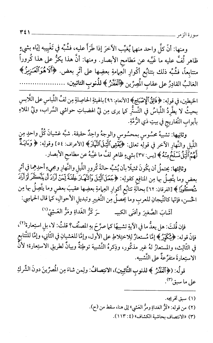 فإن قلت: هل يعد ما في الآية تشبيهًا كما صرح به المصنف؟ قلت: لا، بل استعارة، فإن قوله: {يُكَوِّرُ} إما مستعار للاختلاط على الأول، وإما للغشيان في الثاني، وإما للتتابع في الثالث، والمستعار له غير مذكور، وذكره التشبيه توطئة وبيان لطريق الاستعارة؛ لأن الاستعارة متفرعة على التشبيه.