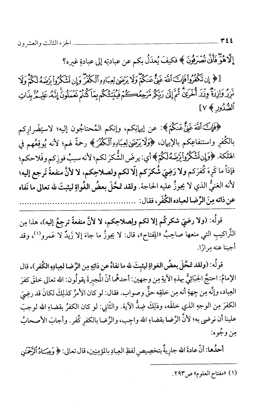 قوله: (ولقد تمحل بعض الغواة ليثبت لله ما نفاه عن ذاته من الرضا لعباده الكفر)، قال الإمام: احتج الجبائي بهذه الآية من وجهين: أحدهما أن المجبرة يقولون: الله تعالى خلق كفر العباد، وإنه من جهة أنه من خلقه حق وصواب. فقال: لو كان الأمر كذلك لكان قد رضي الكفر من الوجه الذي خلقه، وذلك ضد الآية. والثاني: لو كان الكفر بقضاء الله لوجب علينا أن نرضى به؛ لأن الرضا بقضاء الله واجب، والرضا بالكفر كفر. وأجاب الأصحاب من وجوه: