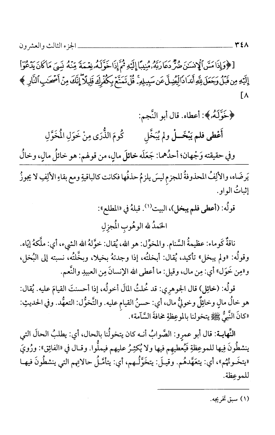 ناقة كوماء: عظيمة السنام. والمخول: هو الله، يقال: خوله الله الشيء، أي: ملكه إياه. وقوله: "ولم يبخل" تأكيد، يقال: أبخلته، إذا وجدته بخيلا، وبخلته، نسبته إلى البخل، و "من خول" أي: من مال، وقيل: ما أعطى الله الإنسان من العبيد والنعم.