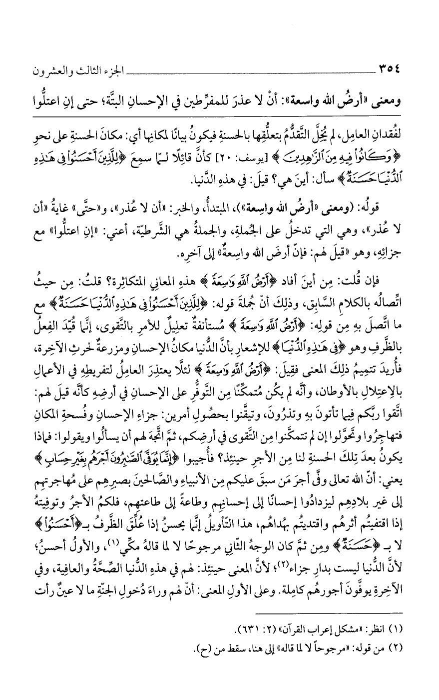 فإن قلت: من أين أفاد {أَرْضُ اللهِ وَاسِعَةٌ} هذه المعاني المتكاثرة؟ قلت: من حيث اتصاله بالكلام السابق، وذلك أن جملة قوله: {لِلَّذِينَ أَحْسَنُوا فِي هَذِهِ الدُّنْيَا حَسَنَةٌ} مع ما اتصل به من قوله: {أَرْضُ اللهِ وَاسِعَةٌ} مستأنفة تعليل للأمر بالتقوى، إنما قيد الفعل بالظرف وهو {فِي هَذِهِ الدُّنْيَا} للإشعار بأن الدنيا مكان الإحسان ومزرعة لحرث الآخرة، فأريد تتميم ذلك المعنى فقيل: {أَرْضُ اللهِ وَاسِعَةٌ} لئلا يعتذر العامل لتفريطه في الأعمال بالاعتلال بالأوطان، وأنه لم يكن متمكنًا من التوفر على الإحسان في أرضه كأنه قيل لهم: اتقوا ربكم فيما تأتون به وتذرون، وتيقنوا بحصول أمرين: جزاء الإحسان وفسحة المكان فتهاجروا وتحولوا إن لم تتمكنوا من التقوى في أرضكم، ثم اتجه لهم أن يسألوا ويقولوا: فماذا يكون بعد تلك الحسنة لنا من الأجر حينئذ؟ فأجيبوا {إِنَّمَا يُوَفَّى الصَّابِرُونَ أَجْرَهُمْ بِغَيْرِ حِسَابٍ} يعني: أن الله تعالى وفي أجر من سبق عليكم من الأنبياء والصالحين بصبرهم على مهاجرتهم إلى غير بلادهم ليزدادوا إحسانًا إلى إحسانهم وطاعةً إلى طاعتهم، فلكم الأجر وتوفيته إذا اقتفيتم أثرهم واقتديتم بهداهم، هذا التأويل إنما يحسن إذا علق الظرف بـ {أَحْسَنُوا} لا بـ {حَسَنَةٌ} ومن ثم كان الوجه الثاني مرجوحًا لا لما قاله مكي، والأول أحسن؛ لأن الدنيا ليست بدار جزاء؛ لأن المعنى حينئذ: لهم في هذه الدنيا الصحة والعافية، وفي الآخرة يوفون أجورهم كاملة. وعلى الأول المعنى: أن لهم وراء دخول الجنة مالا عين رأت