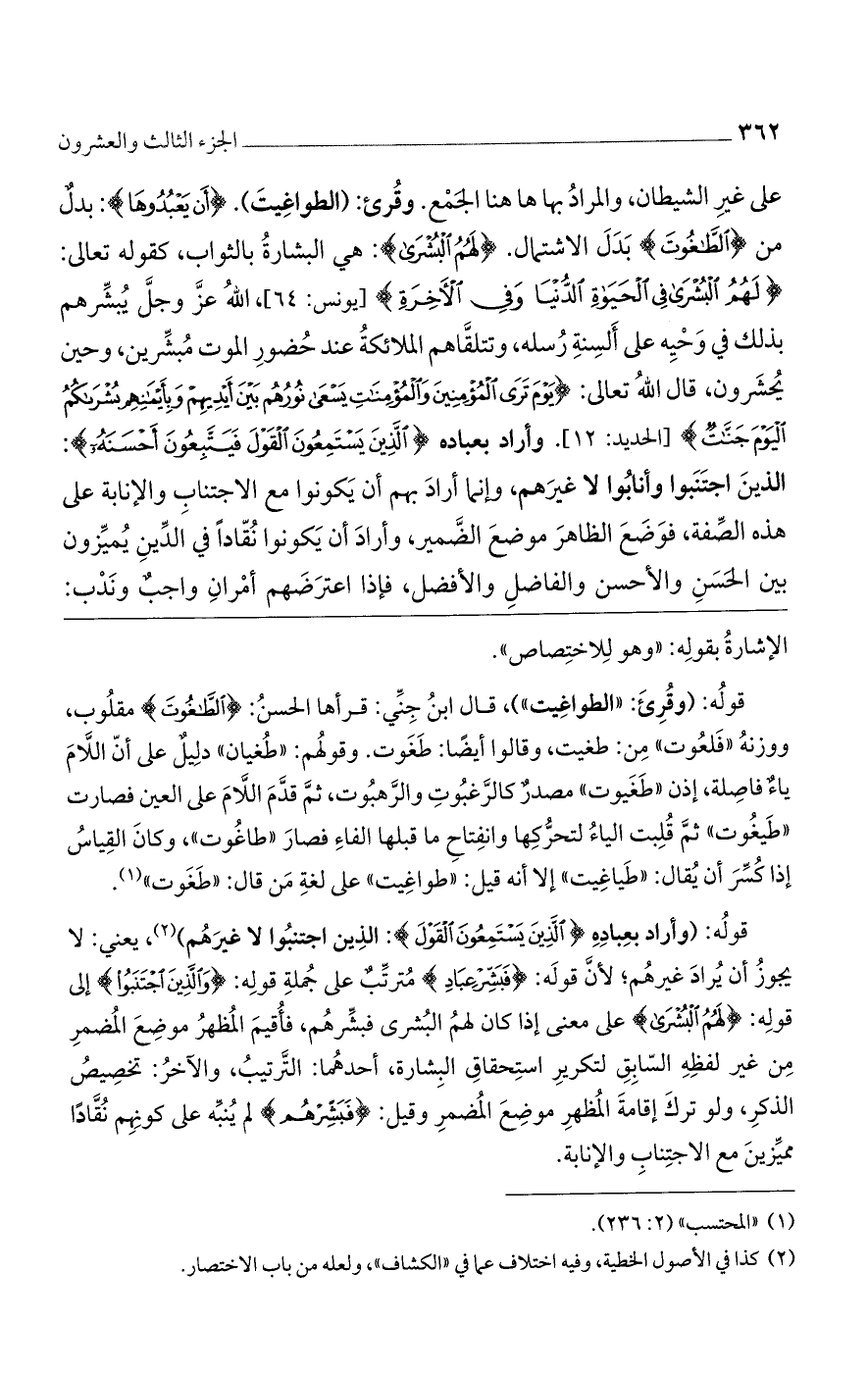 على غير الشيطان، والمراد بما ها هنا الجمع. وقرئ: (الطواغيت). {أَنْ يَعْبُدُوهَا}: بدل من {الطَّاغُوتِ} بدل الاشتمال. {لَهُمُ الْبُشْرَى}: هي البشارة بالثواب، كقوله تعالى: {لَهُمث الْبُشْرَى فِي الْحَيَاةِ الدُّنْيَا وَفِي الْآخِرَةِ} [يونس: 64]، الله عز وجل يبشرهم بذلك في وحيه على ألسنة رسله، وتتلقاهم الملائكة عند حضور الموت مبشرين، وحين يحشرون، قال الله تعالى: {يَوْمَ تَرَى الْمُؤْمِنِينَ وَالْمُؤْمِنَاتِ يَسْعَى نُورُهُمْ بَيْنَ أَيْدِيهِمْ وَبِأَيْمَانِهِمْ بُشْرَاكُمُ الْيَوْمَ جَنَّاتٌ} [الحديد: 12]. وأراد بعباده {الذين يستمعون القول فيتبعون أحسنه}: الذين اجتنبوا وأنابوا لا غيرهم، وإنما أراد بهم أن يكونوا نقادًا في الدين يميزون بين الحسن والأحسن والفاصل والأفضل، فإذا اعترضهم أمران واجب وندب: