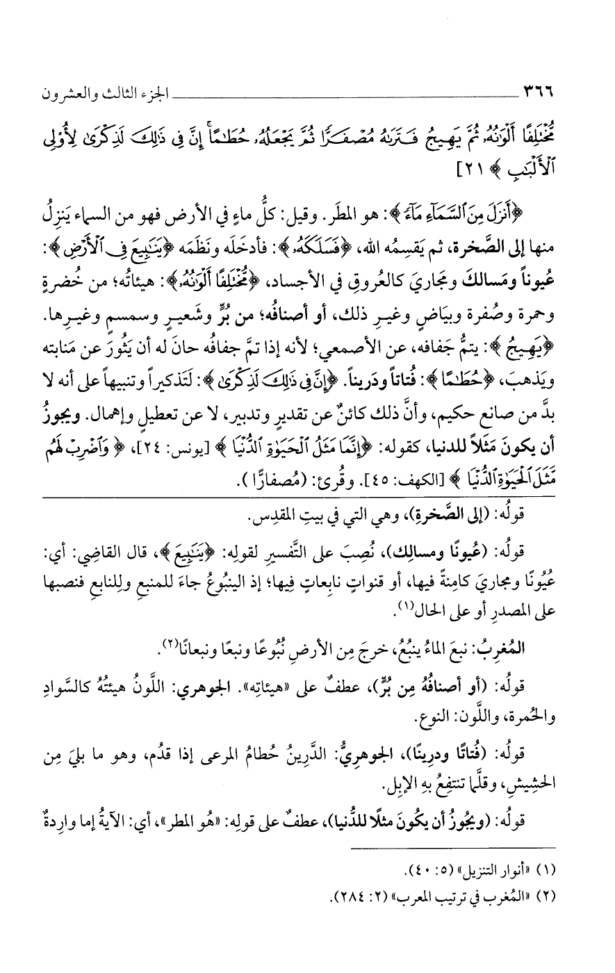 {أَنزَلَ مِنَ السَّمَاءِ مَاءً}: هو المطر. وقيل: كل ماء في الأرض فهو من السماء ينزل منها إلى الصخرة، ثم يقسمه الله، {فَسَلَكَهُ}: فأدخله ونظمه {يَنَابِيعَ فِي الأَرْضِ}: عيونًا ومسالك ومجاري كالعروق في الأجساد {مُّخْتَلِفًا أَلْوَانُهُ}: هيئاته؛ من خضرة وحمرة وصفرة وبياض وغير ذلك، أو أصنافه؛ من بر وشعير وسمسم وغيرها. {يَهِيجُ}: يتم جفافه، عن الأصمعي؛ لأنه إذا تم جفافه حان له أن يثور عن منابته ويذهب، { ..... }: فتاتًا ودرينًا. {إنَّ فِي ذَلِكَ لَذِكْرَى}: لتذكيرًا وتنبيهًا على أنه لابد من صانع حكيم، وأن ذلك كائن عن تقدير وتدبير، لا عن تعطيل وإهمال. ويجوز أن يكون مثلًا للدنيا، كقوله: {إِنَّمَا مَثْلُ الْحِيَاةِ الدُّنْيَا} [يونس: 24]، {وَاضْرِبْ لَهُمْ مَثَلَ الْحَيَاةِ الدُّنْيَا} [الكهف: 45]. وقرئ: (مصفارًا).
