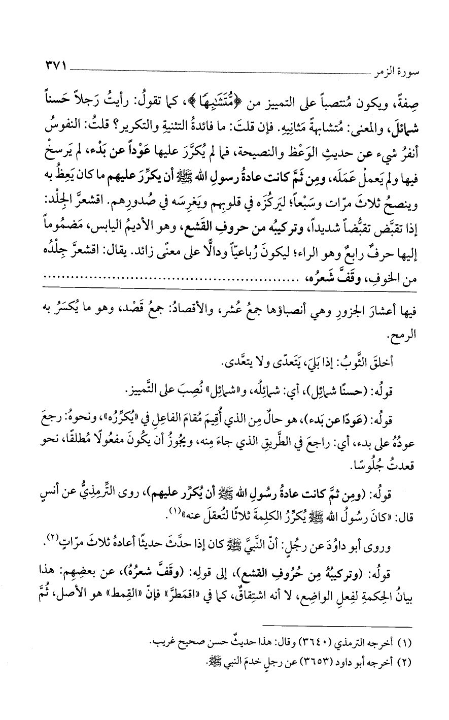 قوله: (ومن ثم كانت عادة رسول الله صلى الله عليه وسلم أن يكرر عليهم)، روى الترمذي عن أنس قال: "كان رسول الله صلى الله عليه وسلم يكرر الكلمة ثلاثًا لتعقل عنه".