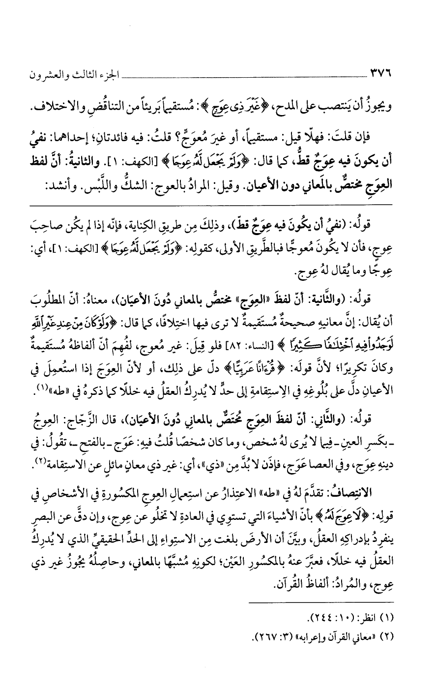 قوله: (والثاني: أن لفظ العوج مختص بالمعاني دون الأعيان)، قال الزجاج: العوج -بكسر العين- فيما لا يرى له شخص، وما كان شخصًا قلت فيه: عوج -بالفتح- تقول: في دينه عوج، وفي العصا عوج، فإذن لا بد من "ذي"، أي: غير ذي معانٍ مائلٍ عن الاستقامة.