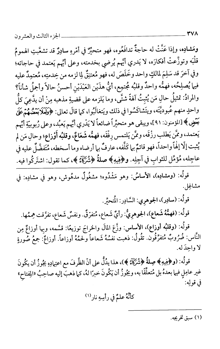 ومشاده، وإذا عنت له حاجة تدافعوه، فهو متحير في أمره سادر، قد تشعبت الهموم قلبه وتوزعت أفكاره، لا يدرى أيهم يرضى بخدمته، وعلى أيهم يعتمد في حاجاته؛ وفي آخر قد سلم لمالك واحد وخلص له، فهو معتنق لما لزمه من خدمته، معتمد عليه فيما يصلحه، فهمه واحد وقلبه مجتمع، أي هذين العبدين أحسن حالًا وأجمل شأنًا؟ والمراد: تمثيل حال من يثبت آلهة شتى، وما يلزمه على قضية مذهبه من أن يدعى كل واحد منهم عبوديته، ويتشاكسوا في ذلك ويتغالبوا، كما قال تعالى: {وَلَعَلا بَعْضُهُمْ عَلى بَعْضٍ} [المؤمنون: 91]، ويبقى هو متحيرًا ضائعًا لا يدرى أيهم يعبد، وعلى ربوبية أيهم يعتمد، وممن يطلب رزقه، وممن يلتمس رفقه، فهمه شعاع، وقلبه أوزاع؛ وحال من لم يثبت إلا إلهًا واحدًا، فهو قائم بما كلفه، عارف بما أرضاه وما أسخطه، متفضل عليه في عاجله، مؤمل للثواب في آجله. و {فِيهِ} صلة {شُرَكَاءَ}، كما تقول: اشتركوا فيه.