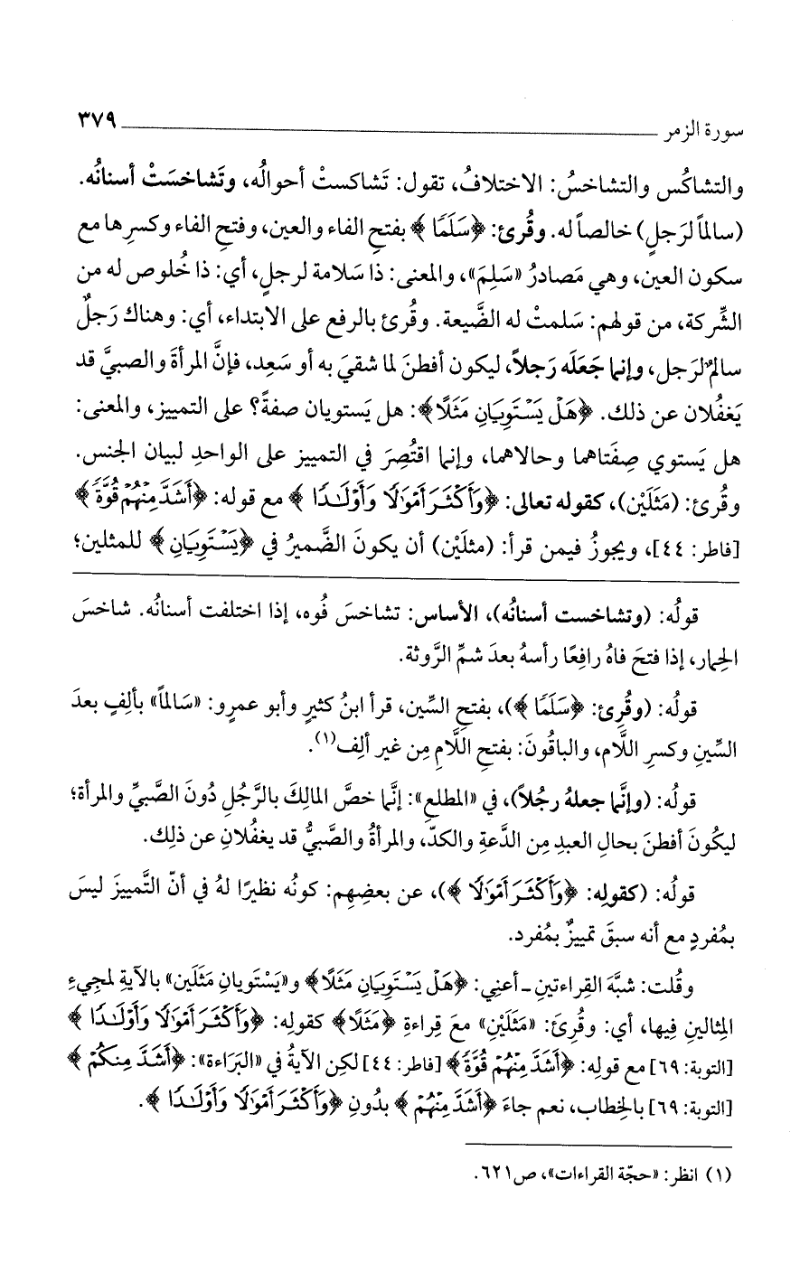 والتشاكس والتشاخس: الاختلاف، تقول: تشاكست أحواله، وتشاخست أسنانه. (سَالِمًا لِرَجُلٍ) خالصًا له. وقرئ: {سَلَمًا}، بفتح الفاء والعين، وفتح الفاء وكسرها مع سكون العين، وهي مصادر "سلم"، والمعنى: ذا سلامة لرجل، أي: ذا خلوص له من الشركة، من قولهم: سلمت له الضيعة. وقرئ بالرفع على الابتداء، أي: وهناك رجل سالم لرجل، وإنما جعله رجلًا، ليكون أفطن لما شقي به أو سعد، فإن المرأة والصبي قد يغفلان عن ذلك. {هَلْ يَسْتَوِيانِ مَثَلًا}: هل يستويان صفة؟ على التمييز. والمعنى: هل يستوي صفتاهما وحالاهما، وإنما اقتصر في التمييز على الواحد لبيان الجنس. وقرئ: (مثلين)، كقوله تعالى: {وَأَكْثَرَ أَمْوالًا وَأَوْلادًا} مع قوله: {أَشَدَّ مِنْهُمْ قُوَّةً} [فاطر: 44]، ويجوز فيمن قرأ: (مثلين)، أن يكون الضمير في {يَسْتَوِيانِ} للمثلين؛