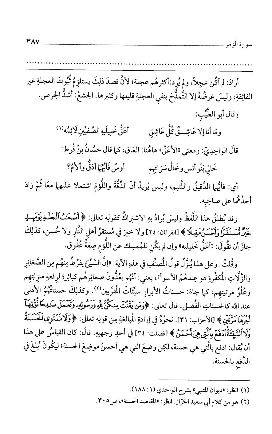 وقلت: وعلى هذا ينزل قول المصنف في هذه الآية: "إن السيء يفرط منهم من الصغائر والزلات المكفرة هو عندهم الأسوأ"، يعني: أنهم يعدون صغائرهم كبائر؛ لرفعة منزلته وعلو مرتبتهم، كما جاء: حسنات الأبرار سيئات المقربين. وكذلك حسناتهم الأدنى عند الله كالحسنات الفضلى. قال تعالى: {ومَن يَقْنُتْ مِنكُنَّ لِلَّهِ ورَسُولِهِ وتَعْمَلْ صَالِحًا نُّؤْتِهَا أَجْرَهَا مَرَّتَيْنِ} [الأحزاب: 31]. نحوه في إرادة المبالغة من قوله تعالى: {وَلَا تَسْتَوِي الْحَسَنَةُ وَلَا السَّيِّئَةُ ادْفَعْ بِالَّتِي هِيَ أَحْسَنُ} [فصلت: 34] في أحد وجهيه. قال: كان القياس على هذا أن يقال: ادفع بالتي حسنة، لكن وضع التي هي أحسن موضع الحسنة؛ ليكون أبلغ في الدفع بالحسنة.