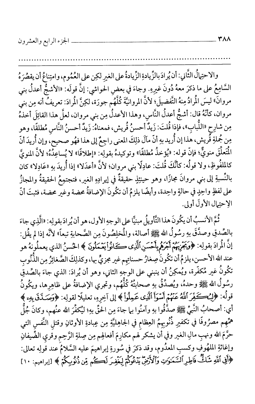 ثم الأنسب أن يكون هذا التأويل مبنيًا على الوجه الأول، هو أن يراد بقوله: "الذي جاء بالصدق وصدق به رسول الله صلى الله عليه وسلم أصالة، والمخلصون من الصحابة تبعًا" لأنه إذا لم يقل: إن المراد بقوله: {ويَجْزِيَهُمْ أَجْرَهُم بِأَحْسَنِ الَّذِي كَانُوا يَعْمَلُونَ} الحسن الذي يعملونه هو عند الله الأحسن، يلزم أن تكون صغار حسناتهم غير مجزي بها، وكذلك الصغائر من الذنوب تكون غير مكفرة، ويمكن أن ينبني على الوجه الثاني، وهو أن يراد: الذي جاء بالصدق رسول الله صلى الله عليه وسلم وحده، ويصدق به صحابته كلهم، وتجري الإضافة على ظاهرها، ويكون قوله: {لِيُكَفِّرَ اللَّهُ عَنْهُمْ أَسْوَأَ الَّذِي عَمِلُوا} إلى آخره تعليلًا لقوله: {وَصَدَّقَ بِهِ} أي: أصحاب النبي صلى الله عليه وسلم صدقوا به وآمنوا بما جاء من الحق به؛ ليكفر الله عنهم، وكان جل همهم مصروفًا في تكفير ذنوبهم العظام في الجاهلية من عبادة الأوثان وقتل النفس التي حرم الله ونهب مال الغير وفي أن يشكر لهم مكارم أفعالهم من صلة الرحم وقري الضيفان وإغاثة الملهوف وكسب المعدوم، وقد ذكر في سورة إبراهيم عليه السلام عند قوله تعالى: {أَفِي اللَّهِ شَكٌّ فَاطِرِ السَّمَاوَاتِ وَالْأَرْضِ يَدْعُوكُمْ لِيَغْفِرَ لَكُمْ مِنْ ذُنُوبِكُمْ} [إبراهيم: 10]