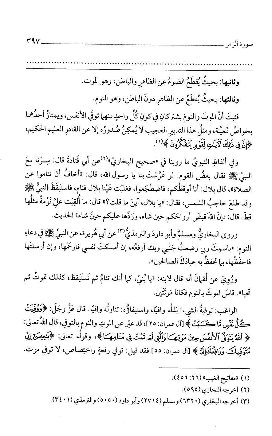 الراغب: توفية الشيء: بذله وافيًا، واستيفاؤه: تناوله وافيًا. قال عز وجل: {وَوُفِّيَتْ كُلُّ نَفْسٍ مَا كَسَبَتْ} [آل عمران: 25]، قد عبر عن الموت والنوم بالتوفي، قال الله تعالى: {اللَّهُ يَتَوَفَّى الْأَنْفُسَ حِينَ مَوْتِها وَالَّتِي لَمْ تَمُتْ فِي مَنامِها}، وقوله تعالى: {يَا عِيسَى إِنِّي مُتَوَفِّيكَ وَرَافِعُكَ إِلَيَّ} [آل عمران: 55] فقد قيل: توفي رفعة واختصاص، لا توفي موت.