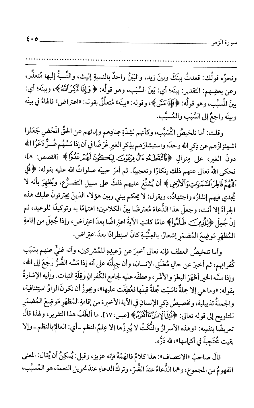 ونحوه قولك: قعدت بينك وبين زيد، والبين واحد بالنسبة إليك، والنسبة إليها متعذر، وعن بعضهم: التقدير: بينه؛ أي: بين السبب، وهو قوله: {وَإِذَا ذُكِرَ اللهُ}، وبينه؛ أي: بين المسبب، وهو قوله: {فَإِذَا مَسَّ}، وقوله: "بينه" متعلق بقوله: "اعتراض" فالهاء في بينه وبينه راجع إلى السبب والمسبب.