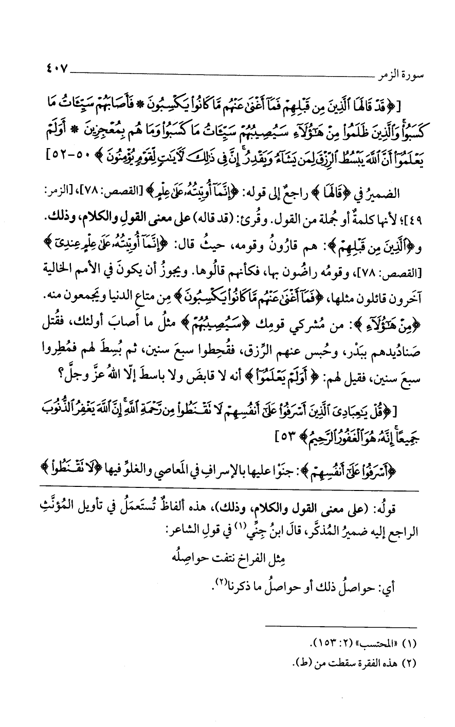 الضمير في {قَالَهَا} راجع إلى قوله: {إِنَّمَا أُوتِيتُهُ عَلَى عِلْمٍ} [القصص: 78]، [الزمر: 49]؛ لأنها كلمة أو جملة من القول. وقرئ: (قد قاله) على معنى القول والكلام، وذلك و {الَّذِينَ مِن قَبْلِهِمْ}: هم قارون وقومه، حيث قال: {إِنَّمَا أُوتِيتُهُ عَلَى عِلْمٍ عِنْدِي} [القصص: 78]، وقومه راضون بها، فكأنهم قالوها. ويجوز أن يكون في الأمم الخالية آخرون قائلون مثلها، {فَمَا أَغْنَى عَنْهُم مَّا كَانُوا يَكْسِبُونَ} من متاع الدنيا ويجمعون منه. {مِنْ هَؤُلاءِ}: من مشركي قومك {سَيُصِيبُهُمْ} مثل ما أصاب أولئك، فقتل صناديدهم ببدر، وحبس عنهم الرزق، فقحطوا سبع سنين، ثم بسط لهم فمطروا سبع سنين، فقيل لهم: {أَوَ لَمْ يَعْلَمُوا} أنه لا قابض ولا باسط إلا الله عز وجل؟