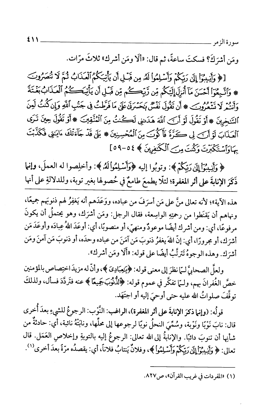 {وأَنِيبُوا إلَى رَبِّكُمْ}: وتوبوا إليه {وأَسْلِمُوا لَهُ}: وأخلصوا له العمل، وإنما ذكر الإنابة على أثر المغفرة؛ لئلا يطمع طامع في حصولها بغير توبة، وللدلالة على أنها