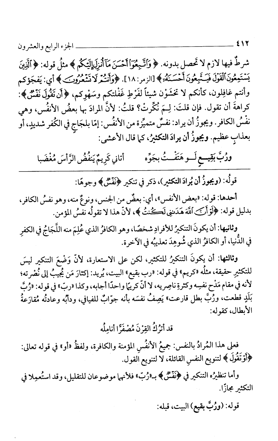 وثالثها: أن يكون التنكير للتكثير، لكن على الاستعارة، لأن وضع التنكير ليس للتكثير حقيقة، مثله "كريم" في قوله: "رب بقيع" البيت، يريد: إكثار من يجيب إلى نصرته؛ لأنه في مقام مدح نفسه وكثرة ناصريه، لا أن كريمًا واحدًا أجابه، وكذا "رب" في قوله: "رب بلد قطعت، ورب بطل قارعت" يصف نفسه بأنه جواب للفيافي، ودأبه وعادته مقارعة الأبطال، كقوله: