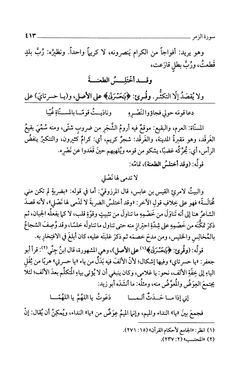 قوله: (وقرئ: {يَا حَسْرَتَى}، على الأصل)، وهي المشهورة، قال ابن جني: قرأ أبو جعفر: "يا حسرتاي" وفيها إشكال؛ لأن الألف فيه بدل من ياء "يا حسرتي" هربًا من ثقل الياء إلى خفة الألف، نحو: يا غلامي، وكان ينبغي أن لا يؤتى بياء المتكلم بعد الألف؛ لئلا يجتمع العوض والمعوض عنه، ومثله: ما أنشده أبو زيد:
