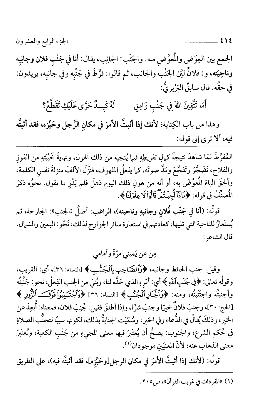 وقيل: جنب الحائط وجانبه، {وَالصَّاحِبِ بِالْجَنْبِ} [النساء: 36]، أي: القريب، وقوله تعالى: {فِي جَنْبِ اللهِ} أي: أمره الذي حده لنا، وبني من الجنب الفعل، نحو: جنبته وأجنبته واجتنبته، ومنه: {وَالْجَارِ الْجُنُبِ} [النساء: 36] {وَاجْتَنِبُوا قَوْلَ الزُّورِ} [الحج: 30]، وجنب فلان خيرًا وجنب شرًا، وإذا أطلق فقيل: جنب فلان، فمعناه: أبعد عن الخير، وذلك يقال في الدعاء وفي الخير، وسميت الجنابة بذلك، لكونها سببًا لتجنب الصلاة في حكم الشرع، والجنوب: يصح أن يعتبر فيها معنى المجيء من جنب الكعبة، ويعتبر معنى الذهاب عنه؛ لأن المعنيين موجودان.