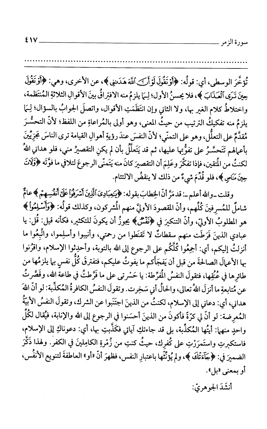 وقلت -والله أعلم-: قد مر أن الخطاب بقوله: {يَا عِبَادِيَ الَّذِينَ أَسْرَفُوا عَلَى أَنْفُسِهِمْ} عام شامل للمسرفين كلهم، وأن المقصود الأولي منهم المشركون، وكذلك قوله: {وَأَسْلِمُوا} هو المطلوب الأولي، وان التنكير في {نَفْسٌ} يجوز أن يكون للتكثير، فكأنه قيل: قل: يا عبادي الذين فرطت منهم سقطات لا تقنطوا من رحمتي، وأنيبوا وأسلموا، واتبعوا ما أنزلت إليكم، أي: أجمعوا كلكم على الرجوع إلى الله بالتوبة، وأحدثوا الإسلام، واقرنوا بها الأعمال الصالحة من قبل أن يفجأكم ما يفوت عليكم، فتفترق كل نفس بما يلزمها من طائرها في عنقها، فتقول النفس المفرطة: يا حسرتى على ما فرطت في طاعة الله، وقصرت عن متابعة ما أنزل الله تعالى، والحال أني سخرت. وتقول النفس الكارفة المكذبة: لو أن الله هداني، أي: دعاني إلى الإسلام، لكنت من الذين اجتنبوا عن الشرك، وتقول النفس الأبية المعرضة: لو أن لي كرة فأكون من الذين أحسنوا في الرجوع إلى الله والإنابة، فيقال لكل واحد منهما: أيتها المكذبة، بلى قد جاءتك آياتي فكذبت بها، أي: دعوناك إلى الإسلام، فاستكبرت واستمررت على كفرك، حيث كنت من مرة الكاملين في الكفر. ولهذا ذكر الضمير في: {جَاءَتْكَ}، ولم يؤنثها باعتبار النفس، فظهر أن "أو" العاطفة لتنويع الأنفس، أو بمعنى "بل".