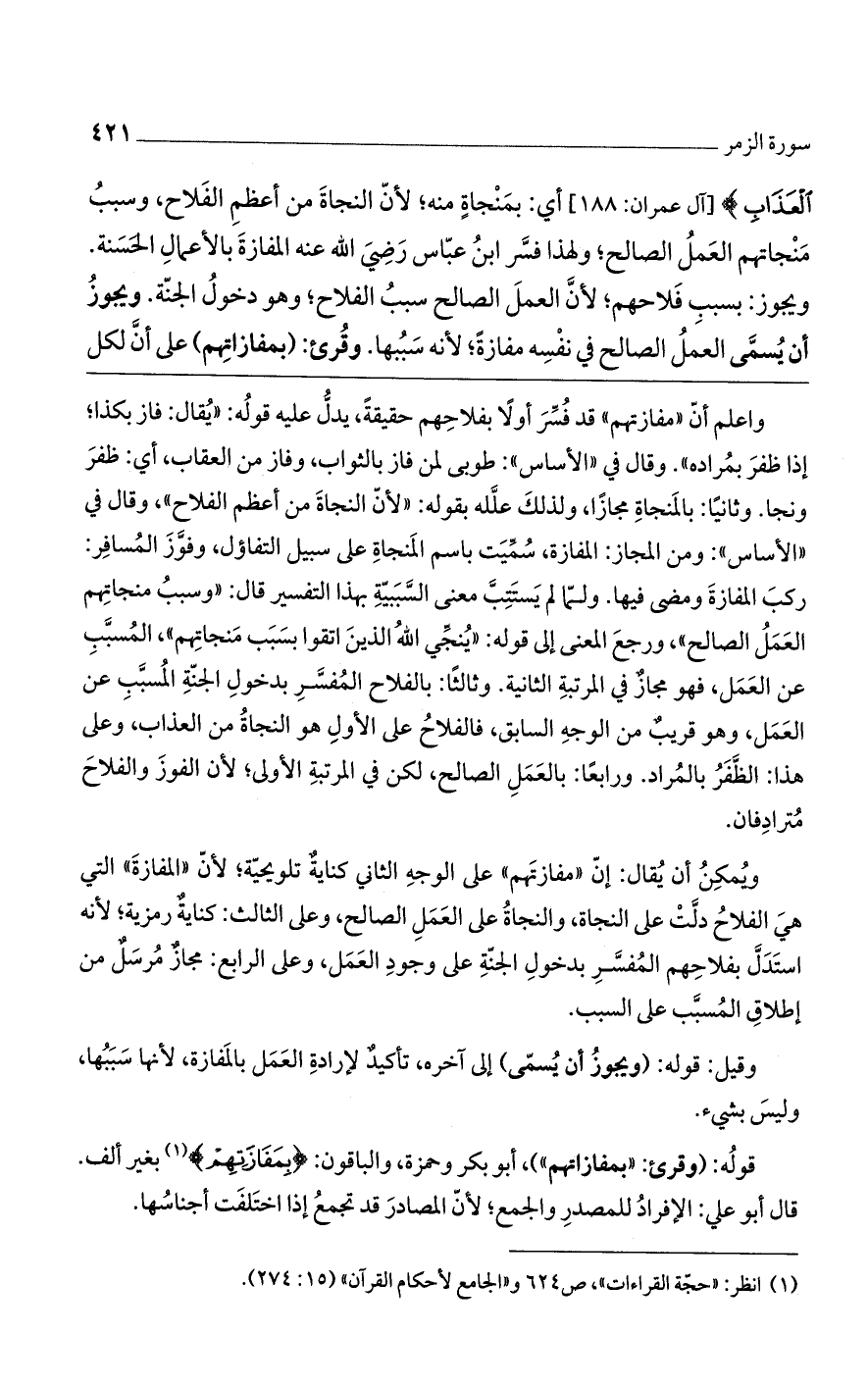 ويمكن أن يقال: إن "مفازتهم" على الوجه الثاني كناية تلويحية؛ لأن "المفازة" التي هي الفلاح دلت على النجاة، والنجاة على العمل الصالح، وعلى الثالث: كناية رمزية؛ لأنه استدل بفلاحهم المفسر بدخول الجنة على وجود العمل، وعلى الرابع: مجاز مرسل من إطلاق المسبب على السبب.