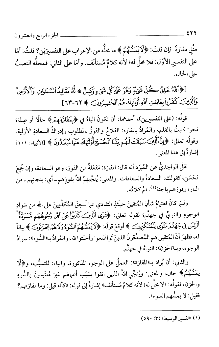 والثاني: أن يراد بـ"المفازة": العمل على الوجوه المذكورة، والباء: للتسبب، و {لَا يَمَسُّهُمُ} حال، والمعنى: وينجي الله الذين اتقوا بسبب أعمالهم غير ملتبسين بالسوء والحزن، فقوله: "لا محل له؛ لأنه كلام مستأنف" إشارة إلى قوله: "كأنه قيل: وما مفازتهم؟ فقيل: لا يمسهم السوء".