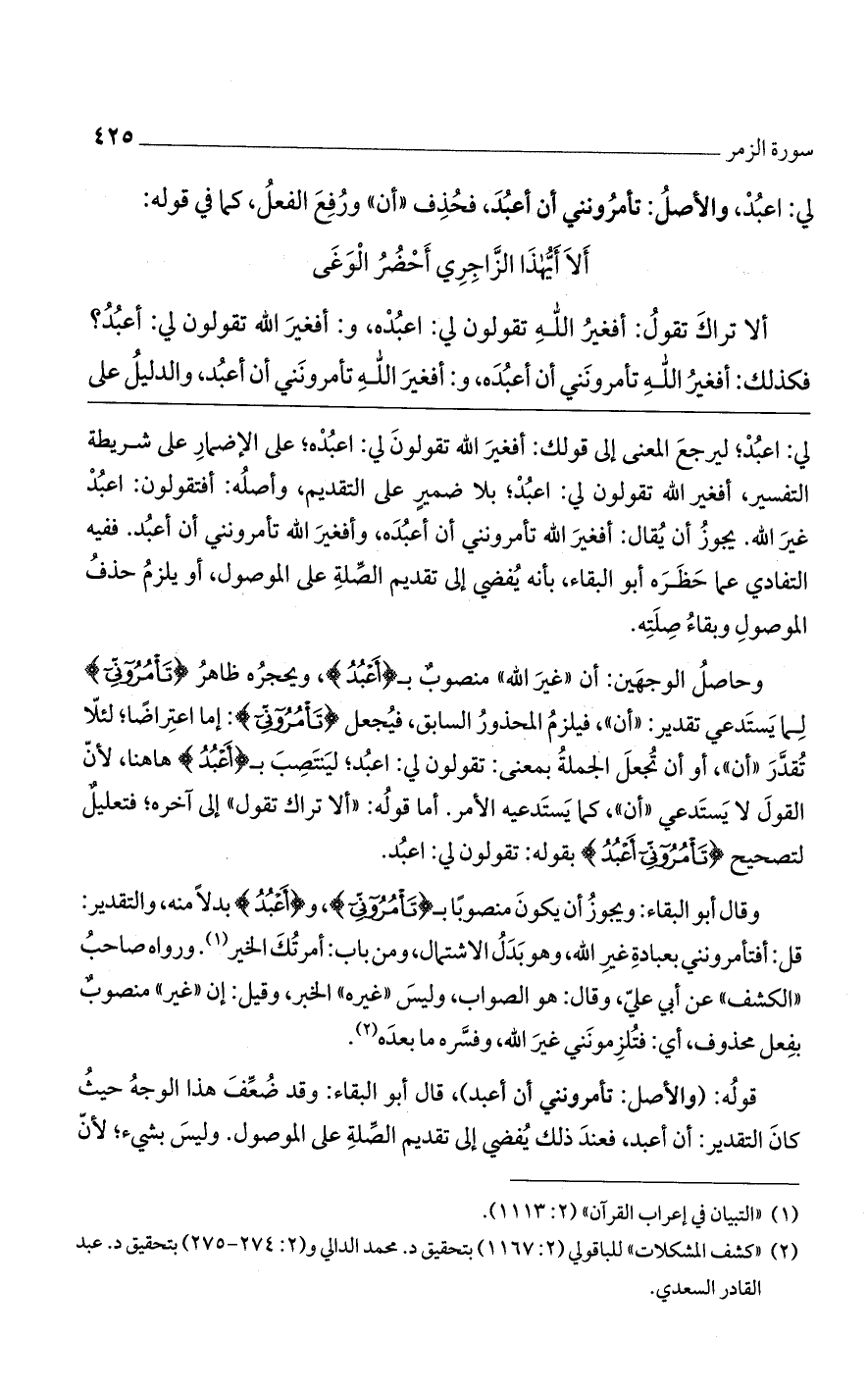 لي: اعبد؛ ليرجع المعنى إلى قولك: أفغير الله تقولون لي: اعبده؛ على الإضمار على شريطة التفسير، أفغير الله تقولون لي: اعبد؛ بلا ضمير على التقديم، وأصله: أفتقولون: اعبد غير الله. يجوز أن يقال: أفغير الله تأمرونني أن أعبده، وأفغير الله تأمرونني أن أعبد. ففيه التفادي عما حظره أبو البقاء، بأنه يفضي إلى تقديم الصلة على الموصول، أو يلزم حذف الموصول وبقاء صلته.