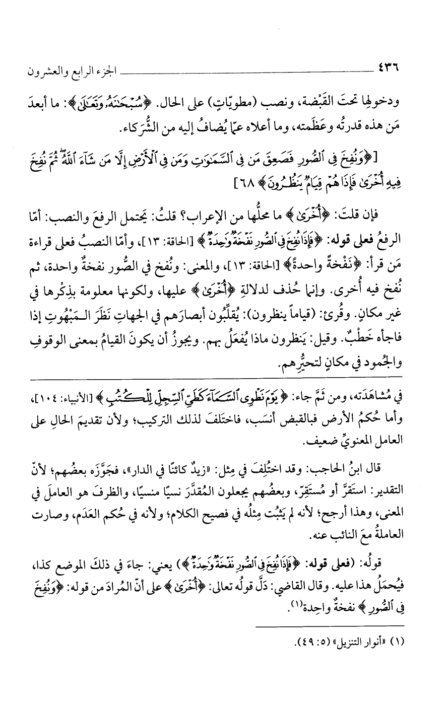 فإن قلت: {أُخْرَى} ما محلها من الإعراب؟ يحتمل الرفع والنصب: أما الرفع فعلى قوله: {فَإِذَا نُفِخَ فِي الصُّورِ نَفْخَةٌ وَاحِدَةٌ} [الحاقة: 13]، وأما النصب فعلى قراءة من قرأ: {نَفْخَةٌ وَاحِدَةٌ} [الحاقة: 13]، والمعنى: ونفخ في الصور نفخة واحدة، ثم نفخ فيه أخرى. وإنما حذف لدلالة {أُخْرَى} عليها، ولكونها معلومة بذكرها في غير مكان. وقرئ: (قيامًا ينظرون): يقلبون أبصارهم في الجهات نظر المبهوت إذا فاجأه خطب. وقيل: ينظرون ماذا يفعل بهم. ويجوز أن يكون القيام بمعنى الوقوف والجهود في مكان لتحيرهم.