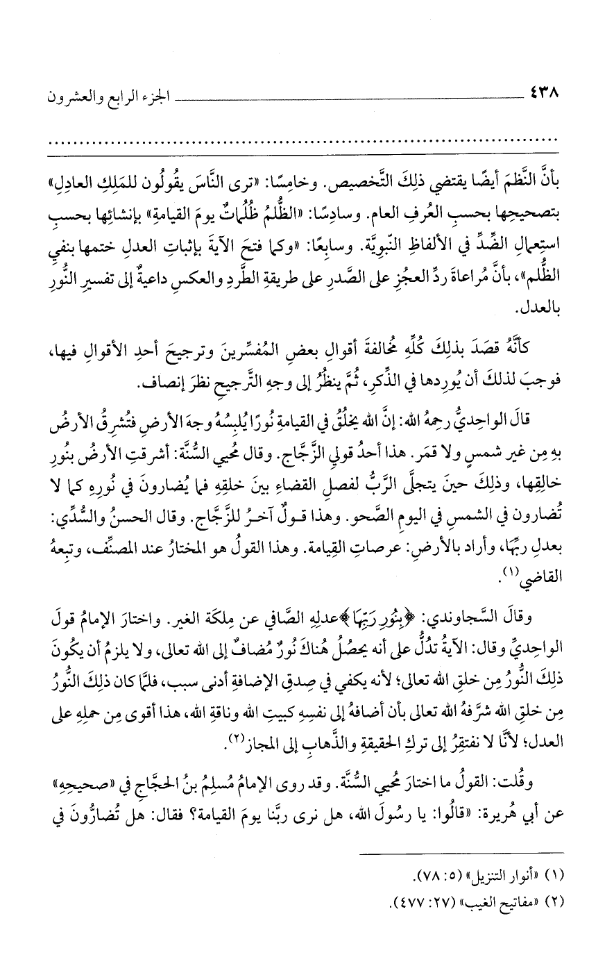 وقال السجاوندي: {بِنُورِ رَبِّهَا} عدله الصافي عن ملكة الغير. واختار الإمام قول الواحدي وقال: الآية تدل على أنه يحصل هناك نور مضاف إلى الله تعالى، ولا يلزم أن يكون ذلك النور من خلق الله تعالى؛ لأنه يكفي في صدق الإضافة أدنى سبب، فلما كان ذلك النور من خلق الله شرفه الله تعالى بأن أضافه إلى نفسه كبيت الله وناقة الله، هذا أقوى من حمله على العدل؛ لأنا نفتقر إلى ترك الحقيقة والذهاب إلى المجاز.