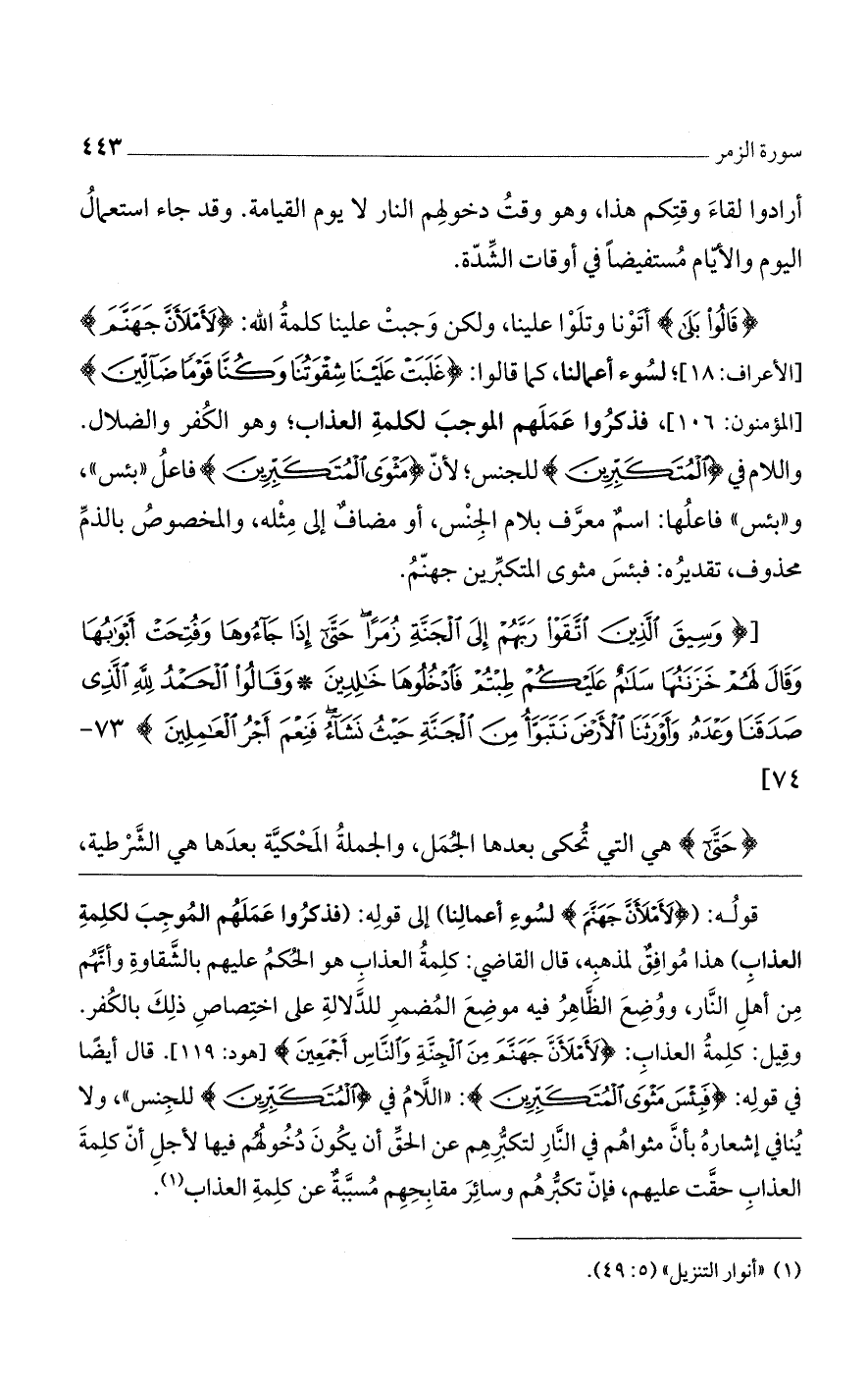 وقيل: كلمة العذاب: {لَأَمْلَأَنَّ جَهَنَّمَ مشنَ الْجِنَّةِ وَالنَّاسِ أَجْمَعِينَ} [هود: 119]. قال أيضًا في قوله: {فَبِئْسَ مَثْوَى المُتَكَبِّرِينَ}: "اللام في {المُتَكَبِّرِينَ} للجنس"، ولا ينافي إشعاره بأن مثواهم في النار لتكبرهم عن الحق أن يكون دخولهم فيها لأجل أن كلمة العذاب حقت عليهم، فإن تكبرهم وسائر مقابحهم مسببة عن كلمة العذاب.