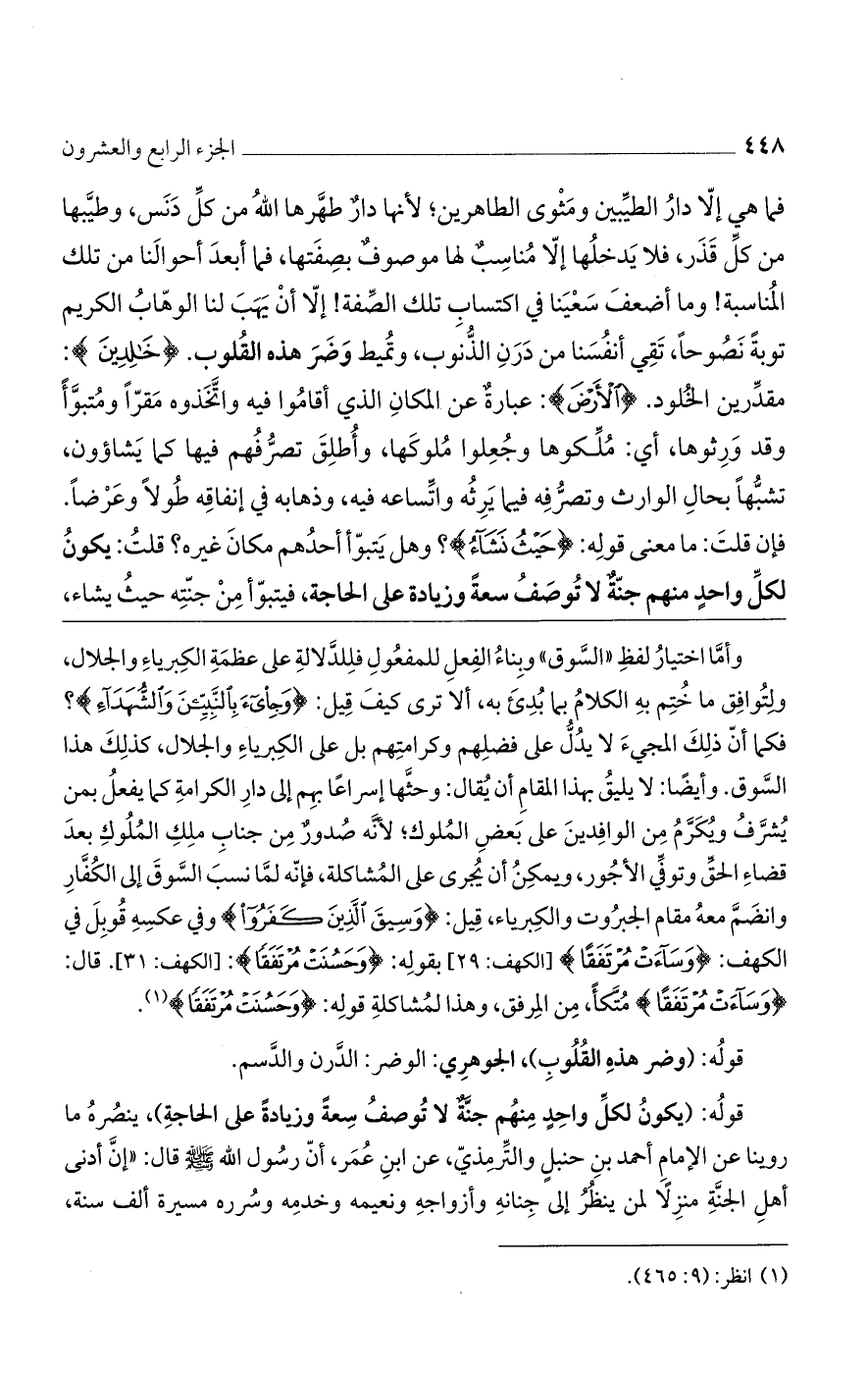 قوله: (يكون لكل واحد منهم جنة لا توصف سعة وزيادة على الحاجة)، ينصره ما روينا عن الإمام أحمد بن حنبل والترمذي، عن ابن عمر، أن رسول الله صلى الله عليه وسلم قال: "إن أدنى أهل الجنة منزلًا لمن ينظر إلى جناية وأزواجه ونعيمه وخدمه وسرره مسيرة ألف سنة،
