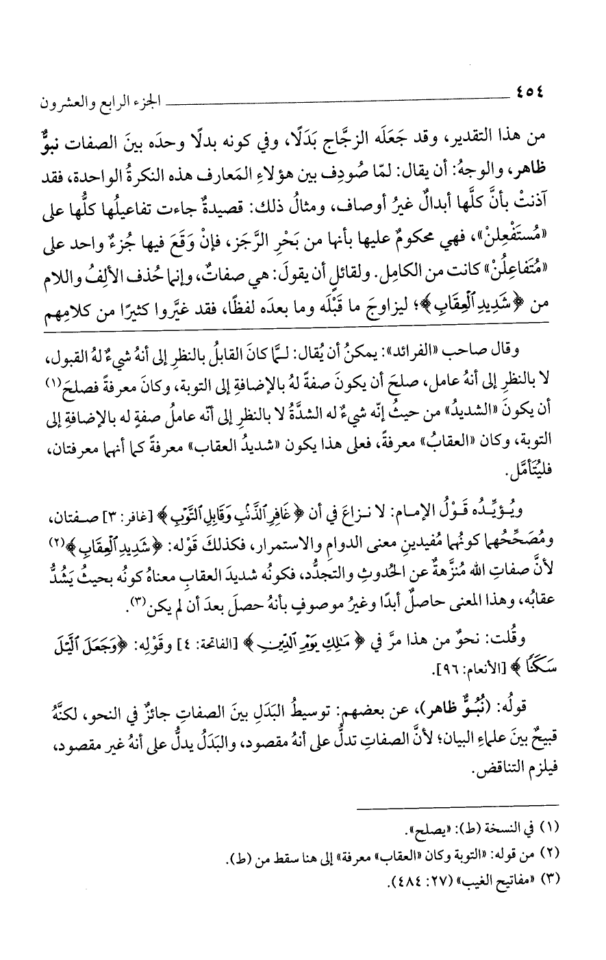 من هذا التقدير، وقد جعله الزجاج بدلًا، وفي كونه بدلًا وحده بين الصفات نبو ظاهر، والوجه: أن يقال: لما صودف بين هؤلاء والمعارف هذه النكرة الواحدة، فقد آذنت بأن كلها أبدال غير أوصاف، ومثال ذلك: قصيدة جاءت تفاعيها كلها على "مستفعلن"، فهي محكوم عليها بأنها من بحر الرجز، فإن وقع فيها جزء واحد على "متفاعلين" كانت من الكامل. ولقائل أن يقول: هي صفات، وإنما حذف الألف واللام من {شَدِيدِ العِقَابِ}، ليزاوج ما قبله وما بعده لفظًا، فقد غيرا وا كثيرا من كلامهم
