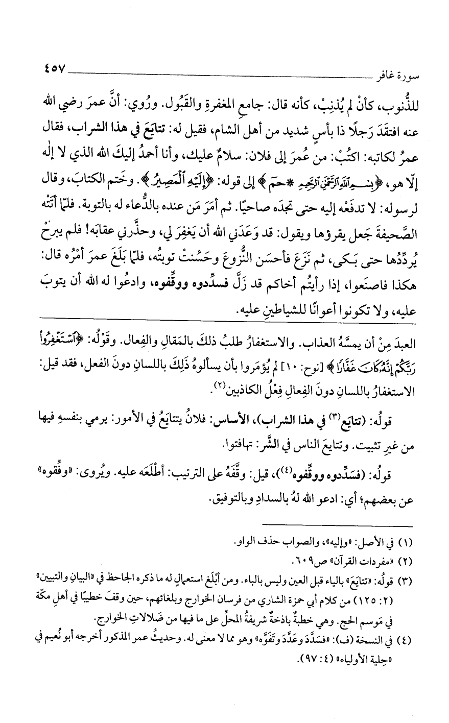 للذنوب، كأن لم يذنب، كأنه قال: جامع المغفرة والقبول. وروي: أن عمر رضي الله عنه افتقد رجلًا ذا بأس شديد من أهل الشام، فقيل له: تتايع في هذا الشراب، فقال عمر لكاتبه: اكتب: من عمر إلى فلان: سلام عليك، وأنا أحمد إليك الله الذي لا إله إلا هو، {بسم الله الرحمن الرحيم * حم] إلى قوله: {إِلَيْهِ الْمَصِيرُ}. وختم الكتاب، وقال لرسوله: لا تدفعه إليه حتى تجده صاحيًا. ثم أمر من عنده بالدعاء له بالتوبة. فلما أتته الصحيفة جعل يقرؤها ويقول: قد وعدني الله أن يغفر لي، وحذرني عقابه! فلم يبرح يرددها حتى بكى، ثم نزع فأحسن الزوع وحسنت توبته، فلما بلغ عمر أمره قال: هكذا فاصنعوا، إذا رأيتم أخاكم قد زل فسددوه ووقفوه، وادعوا له الله أن يتوب عليه، ولا تكونوا أعوانًا للشياطين عليه.