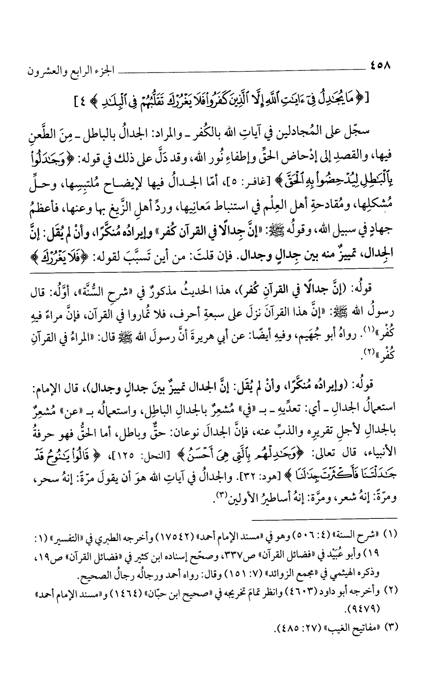 سجل على المجادلين في آيات الله بالكفر_ والمراد: الجدال بالباطل_ من الطعن فيها، والقصد إلى إدحاض الحق وإطفاء نور الله، وقد دل على ذلك في قوله: {وجَادَلُوا بِالْبَاطِلِ لِيُدْحِضُوا بِهِ الحَقَّ} [غافر: 5]، أما الجدال فيها لإيضاح ملتبسها، وحل مشكلها، ومقادحة أهل العلم في استنباط معانيها، ورد أهل الزيغ بها وعنها، فأعظم جهاد في سبيل الله، وقوله صلى الله عليه وسلم: "إن جدالًا في القرآن كفر" وإيراده منكرًا، وأن لم يقل: إن الجدال، تمييز منه بين جدال وجدال. فإن قلت: من أين تسبب لقوله: {فَلا يَغْرُرْكَ}