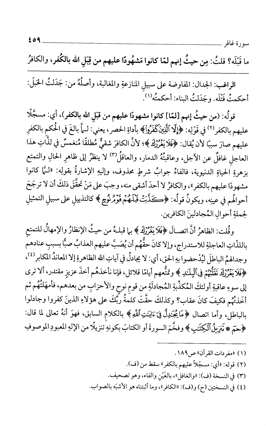 وقلت: الظاهر أن اتصال {فَلا يَغْرُرْكَ} بما قبله من حيث الإنظار والإمهال للتمتع باللذات العاجلة للاستدراج، وإلا كان حقهم أن يصب عليهم العذاب صبًا بسبب عنادهم وجدالهم الباطل ليدحضوا به الحق، أي: لا يجادل في آيات الله الظاهرة إلا المعاند المكابر، {فَلا يَغْرُرْكَ تَقَلُّبُهُمْ فِي البِلادِ} وتمتعهم أيامًا قلائل، فإنا نأخذهم أخذ عزيز مقتدر، ألا ترى إلى سوء عاقبة أولئك المكذبة المجادلة من قوم نوح والأحزاب من بعدهم، فأمهلتهم ثم أخذتهم فكيف كان عقاب؟ وكذلك حقت كلمة ربك على هؤلاء الذين كفروا وجادلوا بالباطل، وأما اتصال {مَا يُجَادِلُ فِي آيَاتِ اللَّهِ} بالكلام السابق، فهو أنه تعالى لما قال: {حم * تَنْزِيلُ الْكِتَابِ} وفخم السورة أو الكتاب بكونه تنزيلًا من الإله المعبود الموصوف.