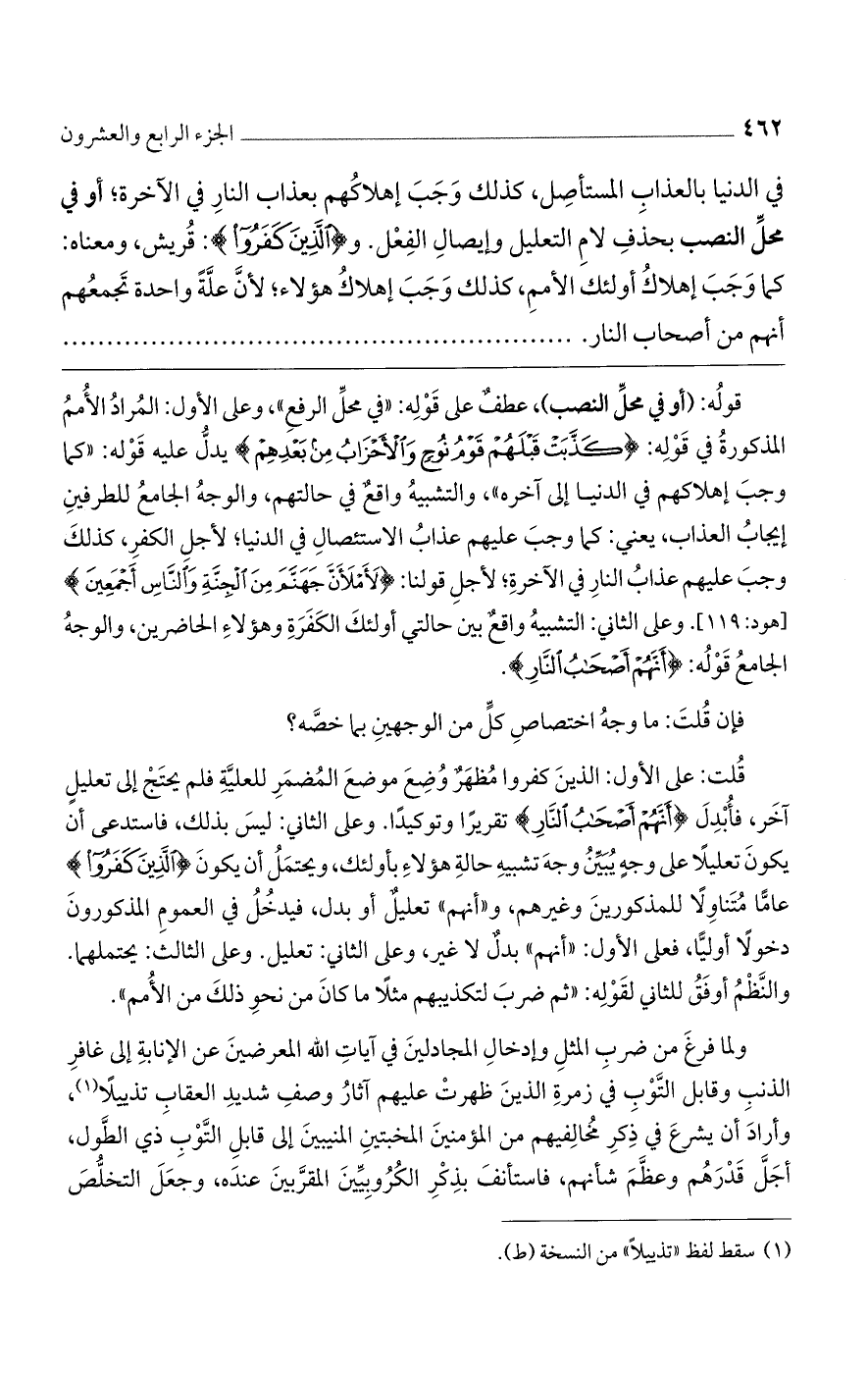 قوله: (أو في محل النصب)، عطف على قوله: " في محل الرفع"، وعلى الأول: المراد الأمم المذكورة في قوله: {كَذَّبَتْ قَبْلَهُمْ قَوْمُ نُوحٍ والأَحْزَابُ مِنْ بَعْدِهِمْ} يدل عليه قوله: " كما وجب إهلاكهم في الدنيا إلى الآخره"، والتشبيه واقع في حالتهم، والوجه الجامع للطرفين إيجاب العذاب، يعني: كما وجب عليهم عذاب الاستئصال في الدنيا؛ لأجل الكفر، كذلك وجب عليهم عذاب النار في الآخرة؛ لأجل قولنا: {لَأَمْلَأَنَّ جَهَنَّمَ مِنَ الْجِنَّةِ وَالنَّاسِ أَجْمَعِينَ} [هود: 119]. وعلى الثاني: التشبيه واقع بين حالتي أولئك الكفرة وهؤلاء الحاضرين، والوجه الجامع قوله: {أَنَّهُمْ أَصْحَابُ النَّارِ}.