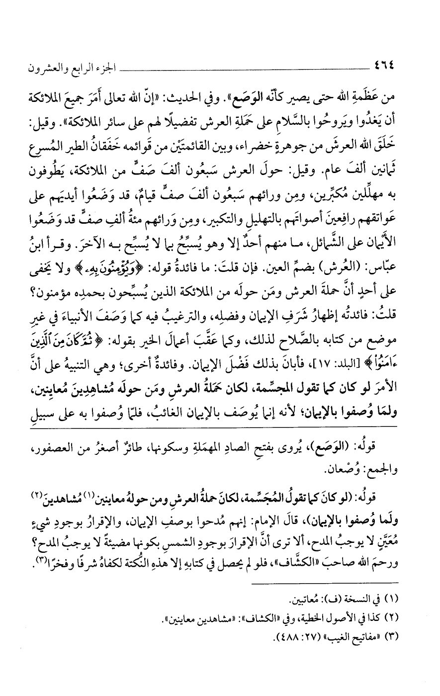 قوله: (لو كان كما تقول المجسمة، لكان حملة العرش ومن حوله معاينين مشاهدين ولما وصفوا بالإيمان)، قال الإمام: إنهم مدحوا بوصف الإيمان، والإقرار بوجود شيء معين لا يوجب المدح، ألا ترى أن الإقرار بوجود الشمس بكونها مضيئة لا يوجب المدح؟ ورحم الله صاحب "الكشاف"، فلو لم يحصل في الكتابه إلا هذه النكتة لكفاه شرفًا وفخرًا.